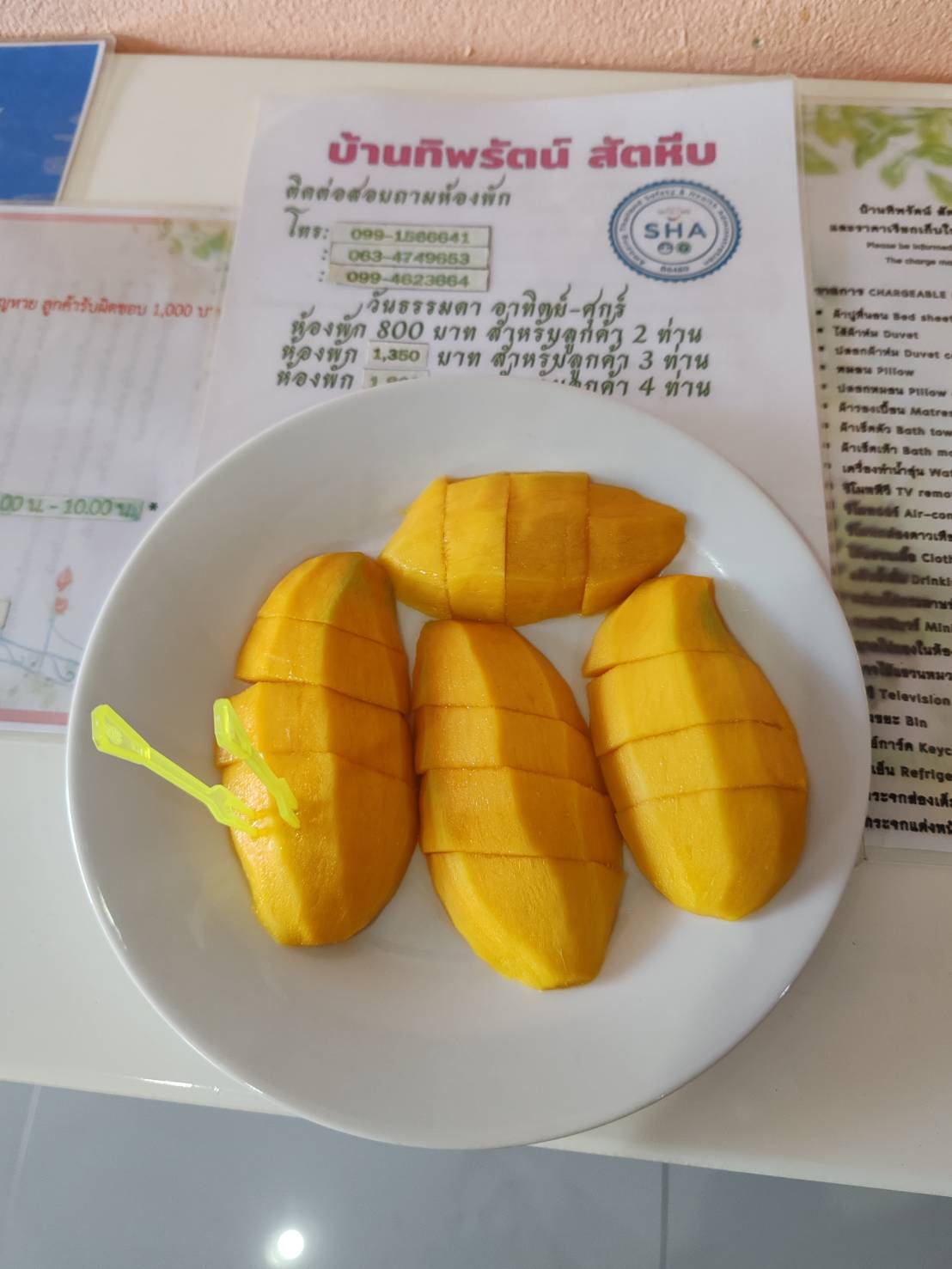 Welcome Fruit เป็นมะม่วงของทางที่พักเอง หวานอร่อย (ไม่ขาย มีไว้ต้อนรับลูกค้าเท่านั้นค่ะ)