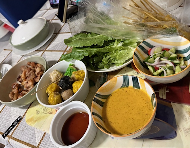 ได้หมูสะเต๊ะ ขนมจีบ สามชั้นทอดทำเอง ผักสลัดจากบริษัท อิ่มๆหลังเหนื่อยจากงานมาทั้งวัน