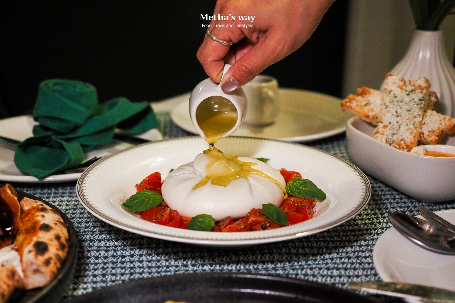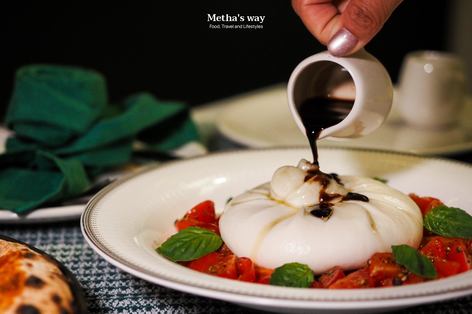 เมนู Insalata alla Caprese di Burrata เป็นสลัดดั้งเดิมจากเกาะคาปรี ประเทศอิตาลี จุดเด่นคือการใช้ชีสบูราต้า ซึ่งทำจากมอสซาเรลลาสดและสเตรคเชียเตลล่า มัดเป็นก้อนสีขาวนุ่ม ให้รสสัมผัสครีมมี่