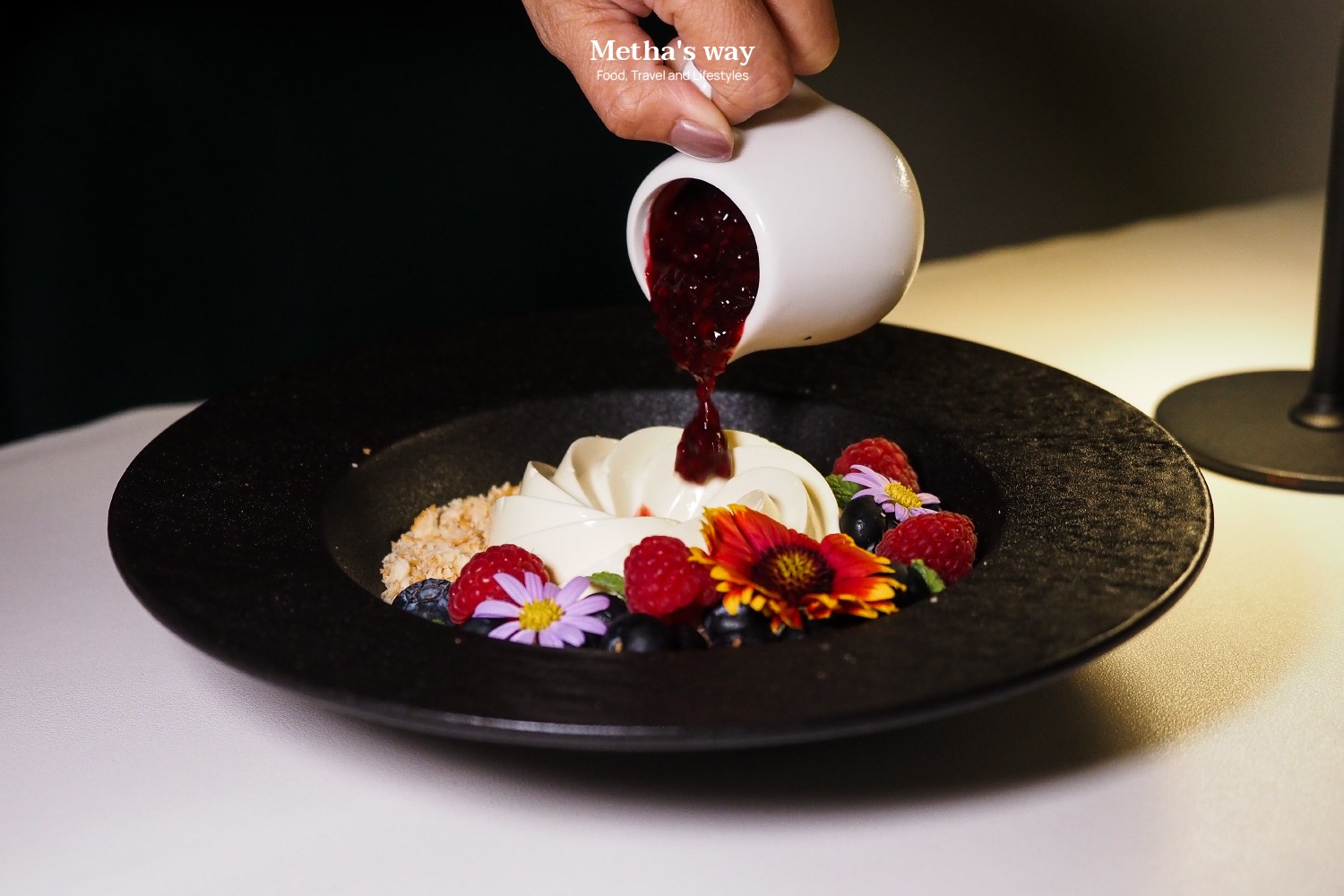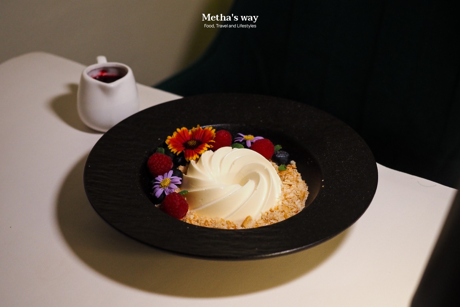 ตัวพานาคอตต้าใช้ครีมนมสดคุณภาพดี รสหวานน้อย เนื้อสัมผัสนุ่มเด้งแต่ยังคงความเป็นคัสตาร์ดแบบอิตาเลียนแท้ๆ ด้านบนโรยแครกเกอร์ เพิ่มความกรุบเล็กๆ ทำให้มีมิติระหว่างความนุ่มและความกรอบในคำเดียว ผลไม้ที่ใช้เป็นมิกซ์เบอร์รีและบลูเบอร์รีสดตามฤดูกาล ให้ความหวานอมเปรี้ยวที่ช่วยบาลานซ์ความมันของเนื้อพานาคอตต้าได้ดี ส่วนซอสราสป์เบอร์รีรสจะออกเปรี้ยวหวานแบบธรรมชาติ