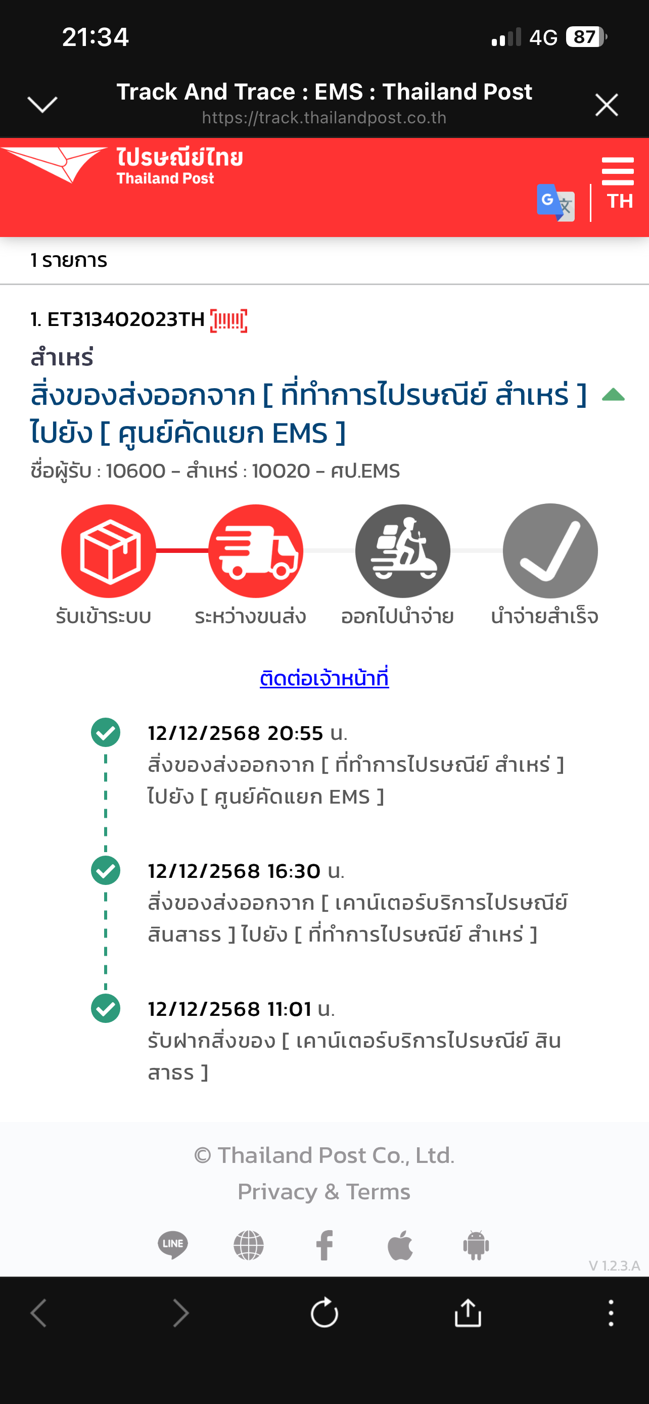 ศุกร์ 16 ธันวาคม 2559 15:02:26 น. เลย รับเข้าระบบ ศุกร์ 16 ธันวาคม 2559 15:58:19 น. เลย ใส่ของลงถุง ศุกร์ 16 ธันวาคม 2559 15:58:25 น. เลย ปิดถุง เสาร์ 17 ธันวาคม 2559 01:28:15 น. ศป.EMS ใส่ของลงถุ
