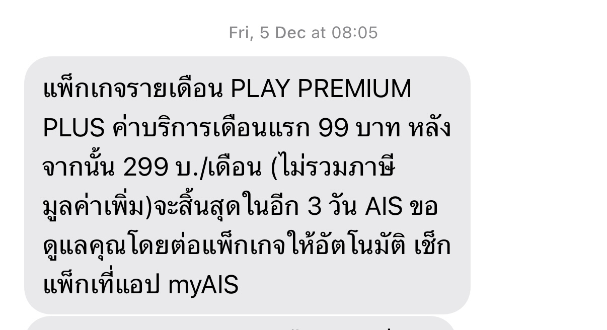 แล้วเราเพิ่งมาเห็นว่า วันที่ 5 ธ.ค. มี SMS มาอีกครั้งว่าต่ออายุการใช้งานแพ็กเกจให้อัตโนมัติ