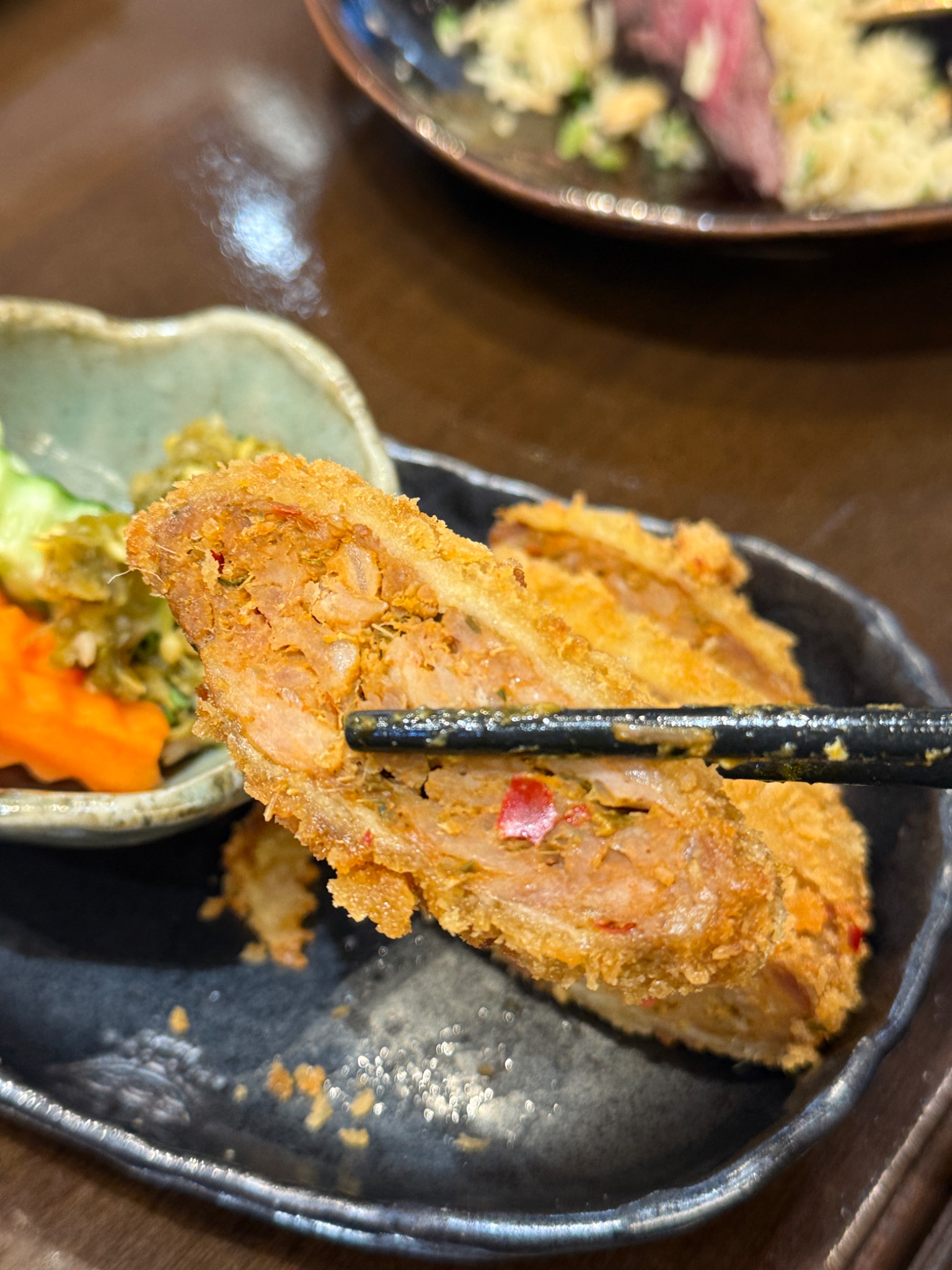 ส่วน ไส้อั่วทงคัตสึ 149++ เป็นเมนูฟิวชั่น เอาอาหารเหนือ มาชุบแป้งทอด เสริฟ กับ พริกหนุ่ม และปักสด ทำเป็นอาหารฟิวชั่น อาหารเมืองกับญี่ปุ่น ตามคอนเซปร้าน เมนํนี้ อร่อยผมชอบ