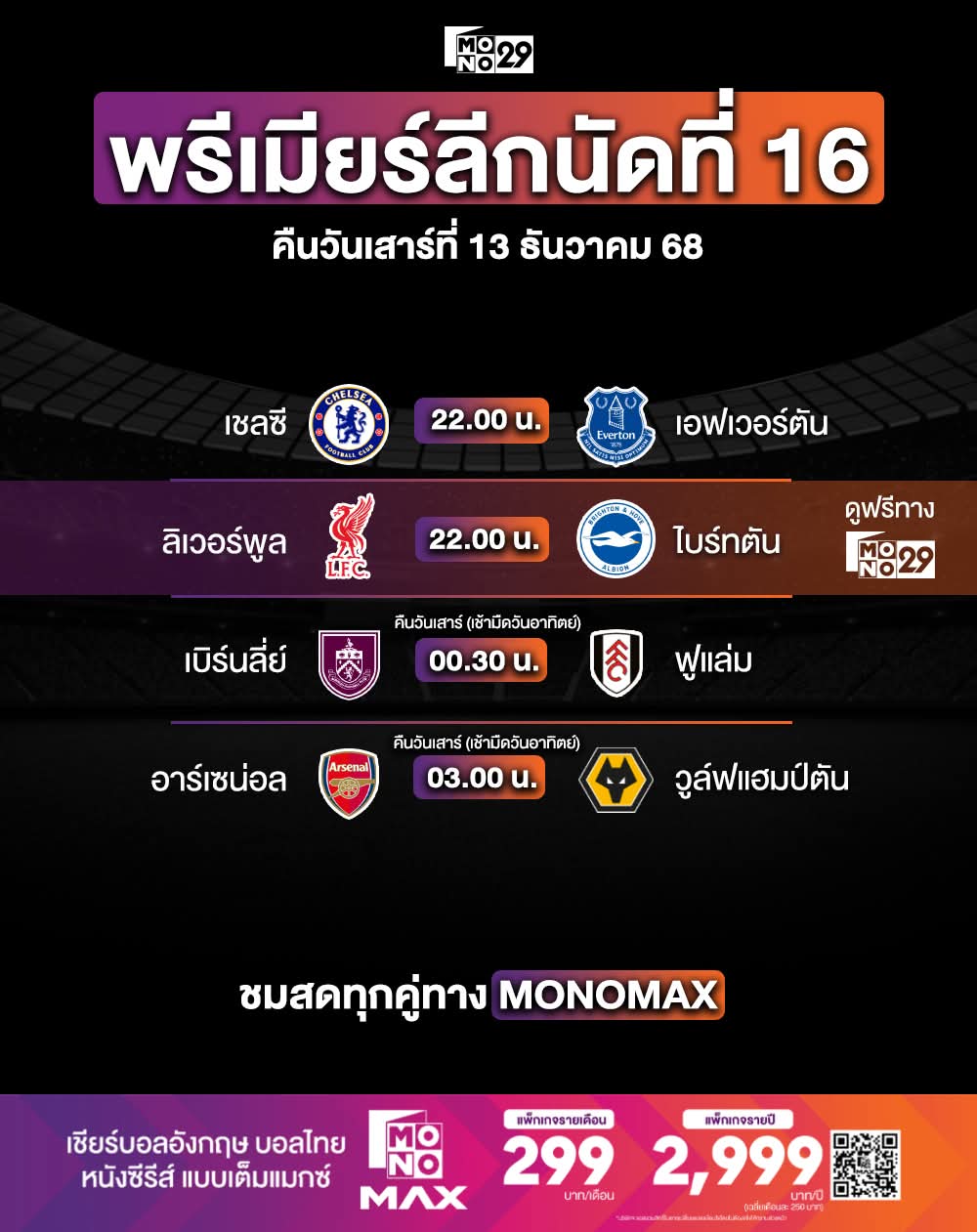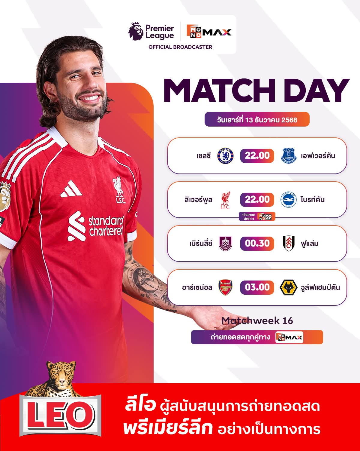 ⚽🏴 #พรีเมียร์ลีก 2025/26 แมตช์ที่ 16 🗓️ วันเสาร์ที่ 13 ธันวาคม 2568