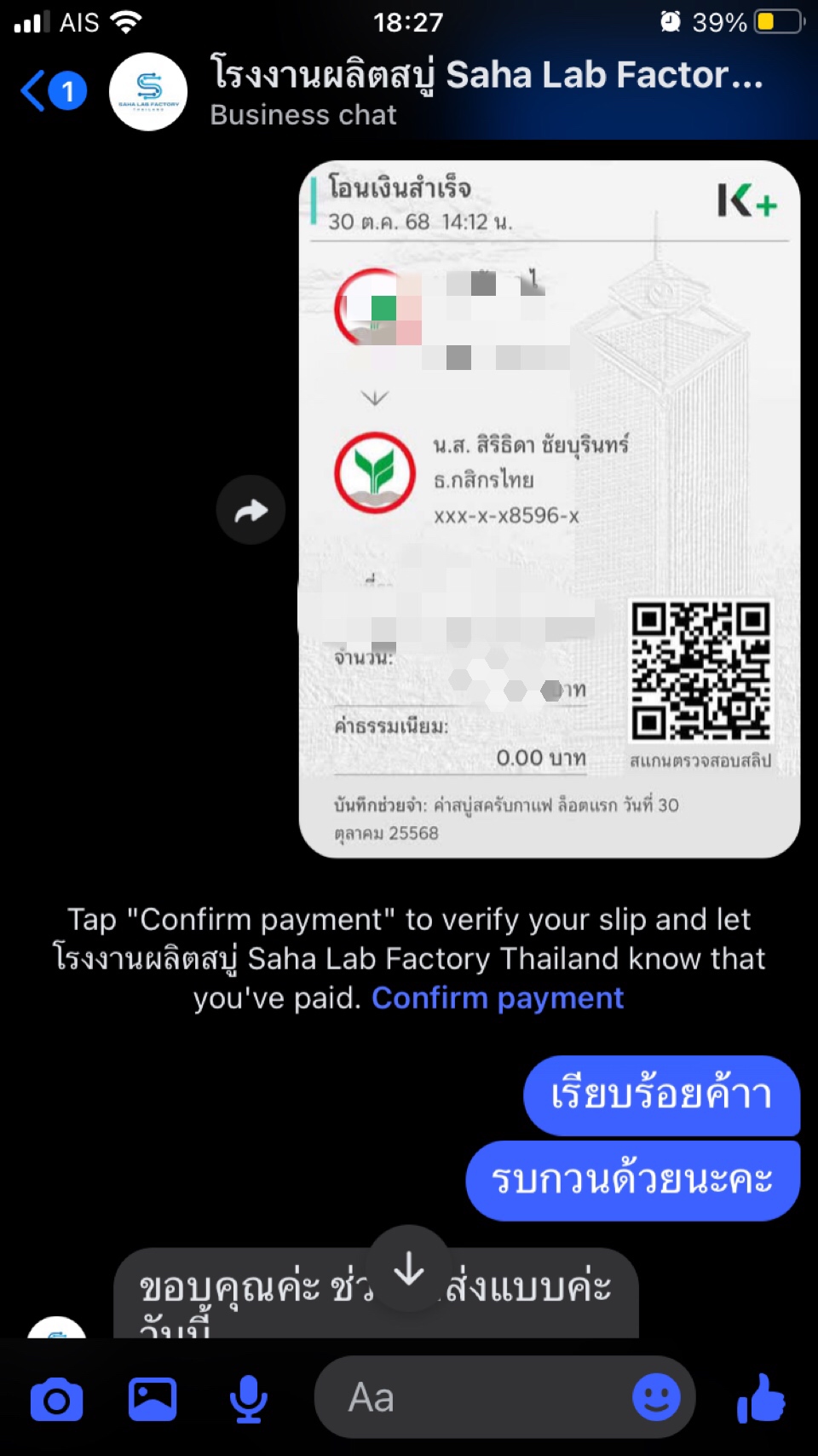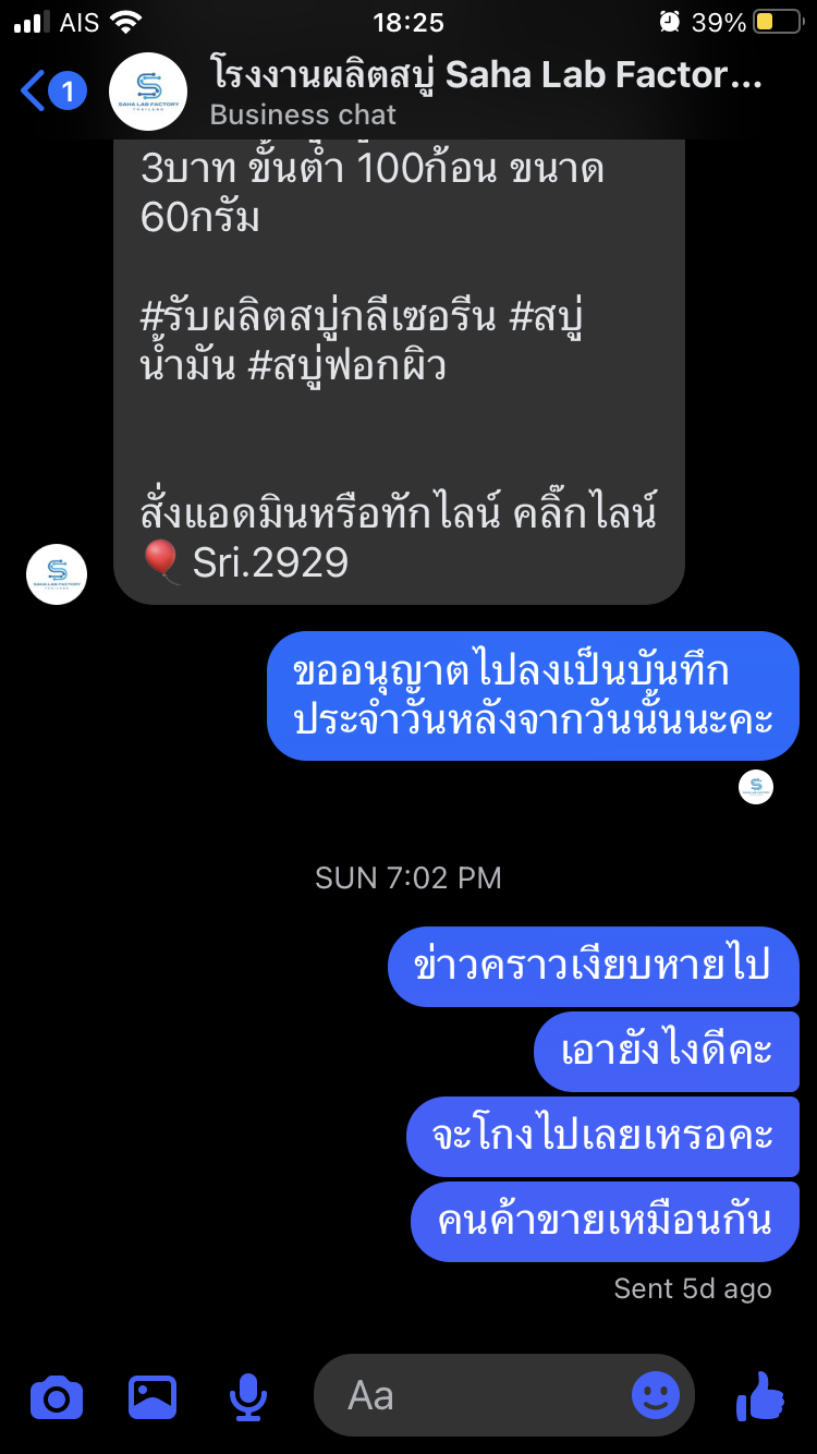 มาเอะใจ! ตอนสั่งของไป สั่งไปวันที่ 30 ตุลาคม 30 พฤศจิกายน ยังไม่ได้รับสบู่ ทั้งๆที่ทางร้านบอก 5-7 วัน แบบอ้าวววว เฮ้อ! หรือว่าเราจะโดน ไม่ย่อท้อคะทวงถามไป ทางนั้นบอกจะจะส่งด่วนๆ เราก็แบบนึกว่าจัดส่งมาแล้ว ส่งเลขไปรษณีย์ให้ เราเช็คแล้วไม่เจอเราก็แบบ แปลกๆแล้ววว โอ๊ยยยยยย ทวงไปครั้งที่ 2 บอกเดี๋ยวตามให้นะคะ ส่งเลขที่พัสดุมาให้ใหม่ เราก็แบบ เอะ! ทำไมต้องอันใหม่ รอนานเป็นอาทิตย์ กะจะแบบไปเช็คเลขพัสดุ ปรากฏว่าลบไปแล้ว สอบถามไปอีกรอบ ทางร้านบอกว่าของเสียหาย พัสดุไปรษณีย์โดนตีกลับเลยไม่ส่ง ทางลูกค้าจะให้เราคืนเงินช่องทางไหนคะ เราก็ส่ง QR code เลขที่บัญชีเราให้ พร้อมทำใจ 😭 ตั้งแต่ 1 ธันวาคม เราส่งข้อความไปถามทางร้านอีกว่าให้เวลาถึง 15 ธันวาคม ว่าถ้าไม่ดำเนินการใดๆ ขออนุญาตไปลงบันทึกข้อความไว้นะคะ พอมาถึงตอนนี้ ตั้งแต่อาทิตย์ที่แล้ว บล็อกเฟสบุ๊คเราเรียบร้อยแล้วจ้า เงินก็ไม่ได้คืน สบู่ก็ไม่ได้จ้า โดนแล้วเรา 😭😭😭