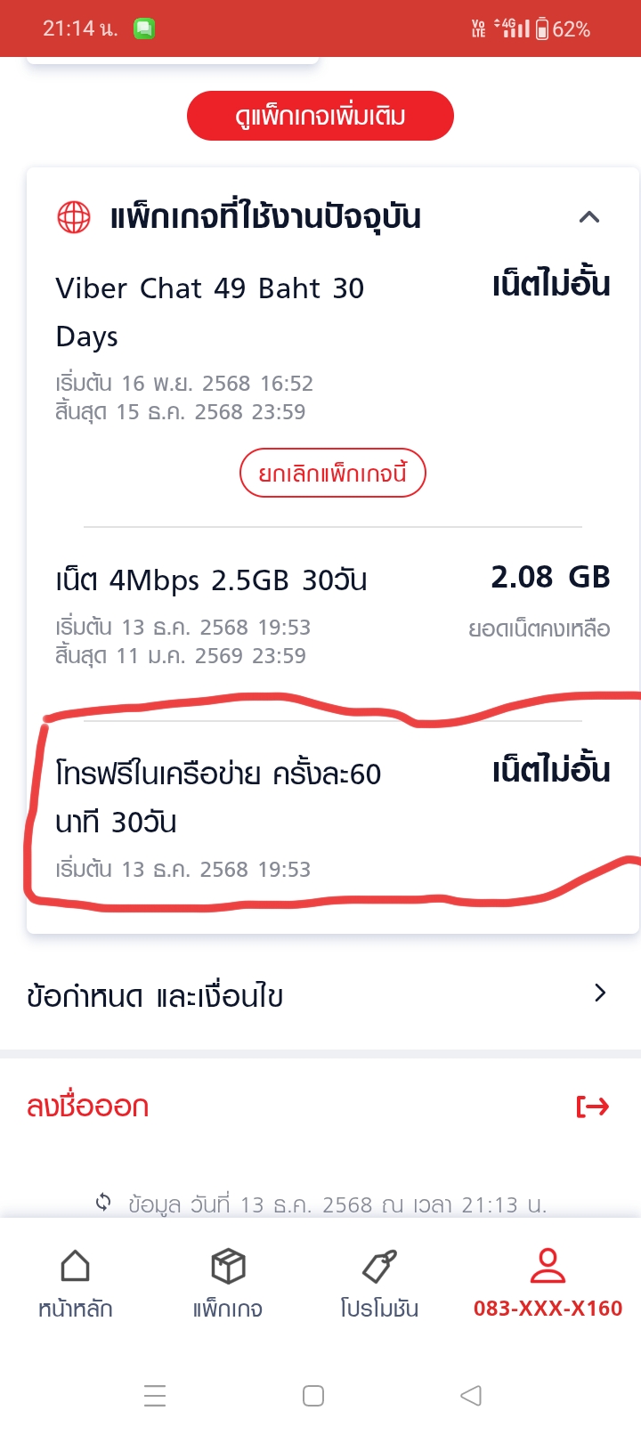 แพ็กเกจเน็ตไม่อั้น 15Mbps(30 GB) FUP 384 kbps+โทรฟรีทุกเครือข่าย + WiFi ไม่อั้น 30 วัน 200บ. กำลังจะต่ออายุรอบใหม่ กรุณาเติมเงินให้เพียงก่อนวันที (ปล.ผมสมัครแพ็คเกจใหม่ไว้แล้วถ้ายกเลิกอันเก่า(ในวงแดง)