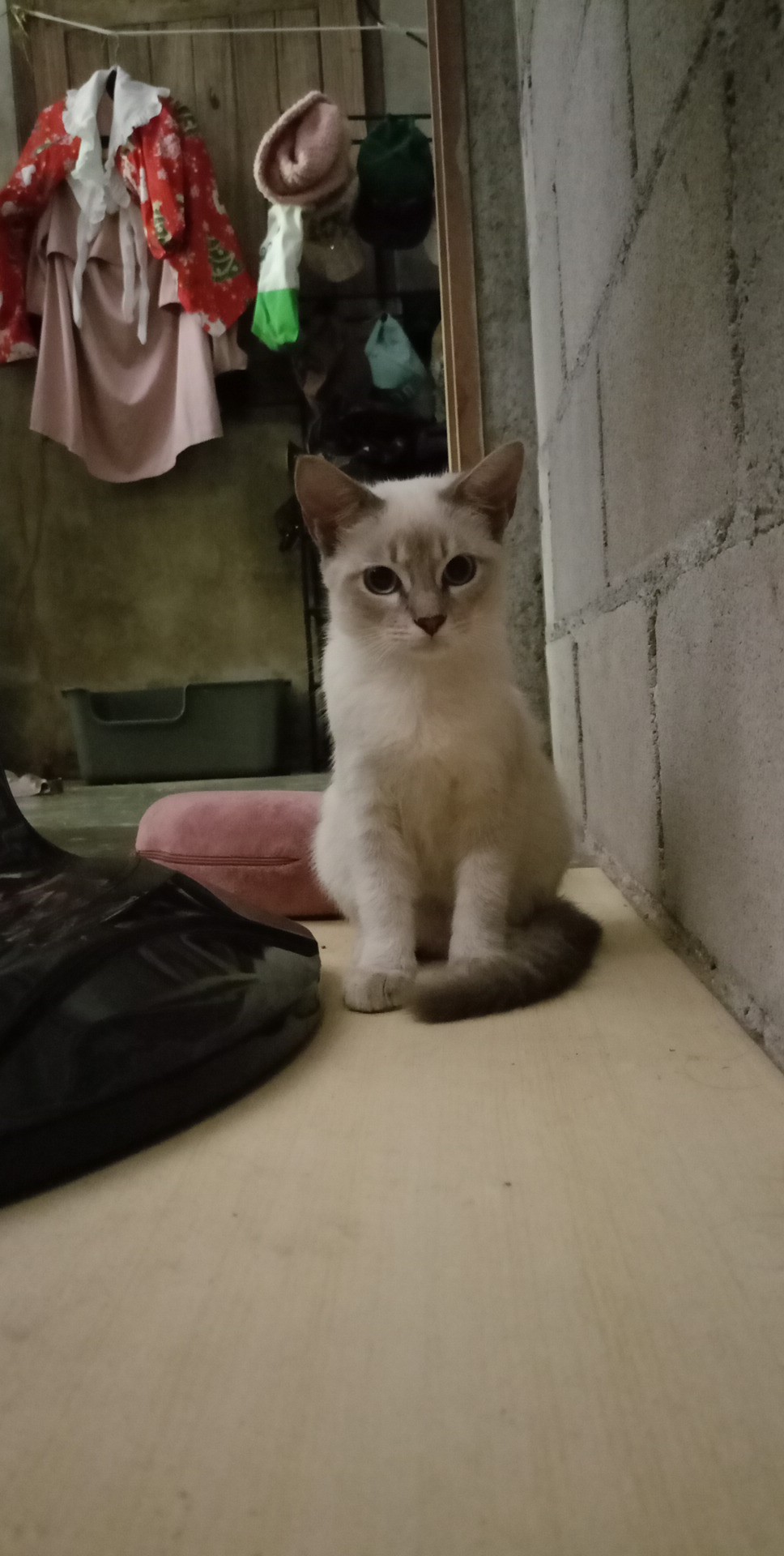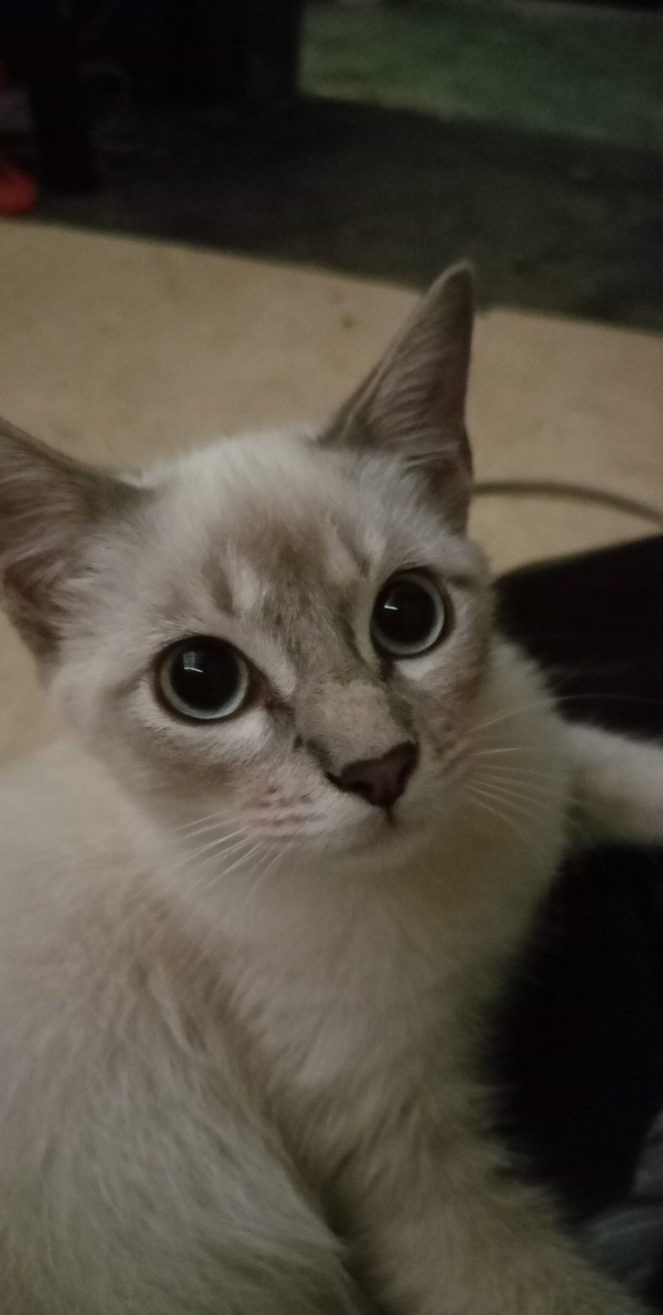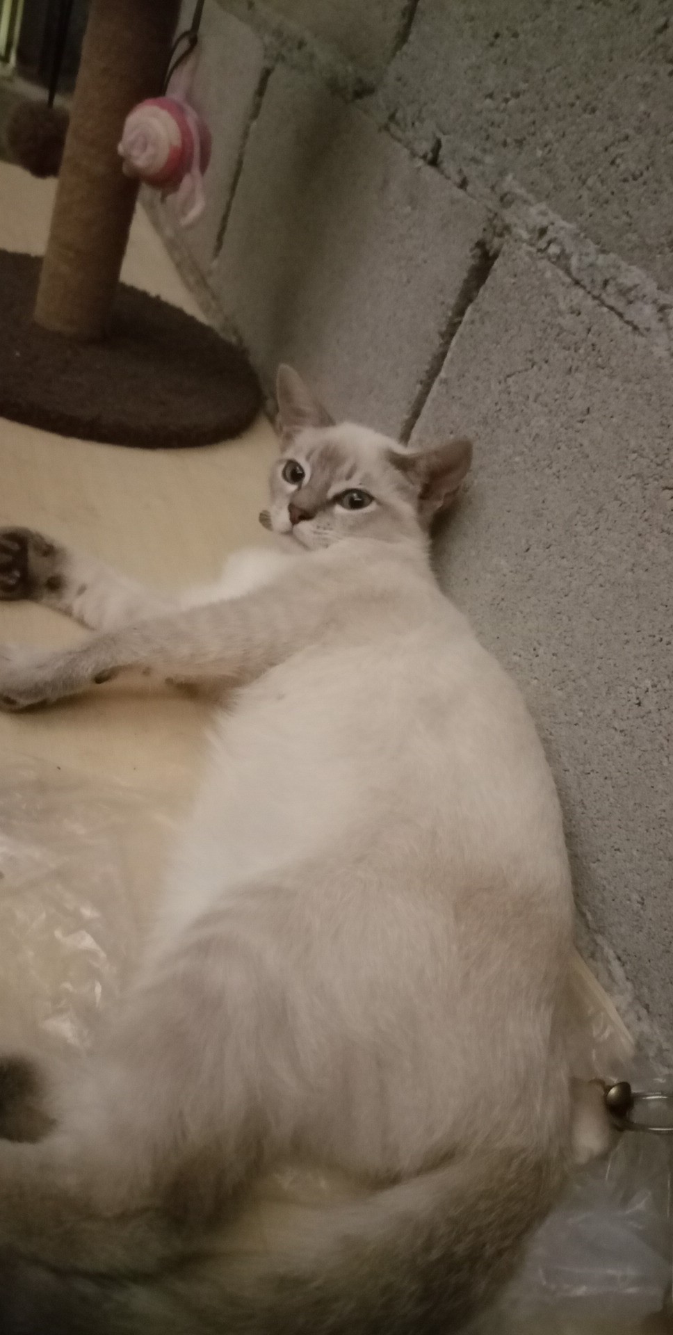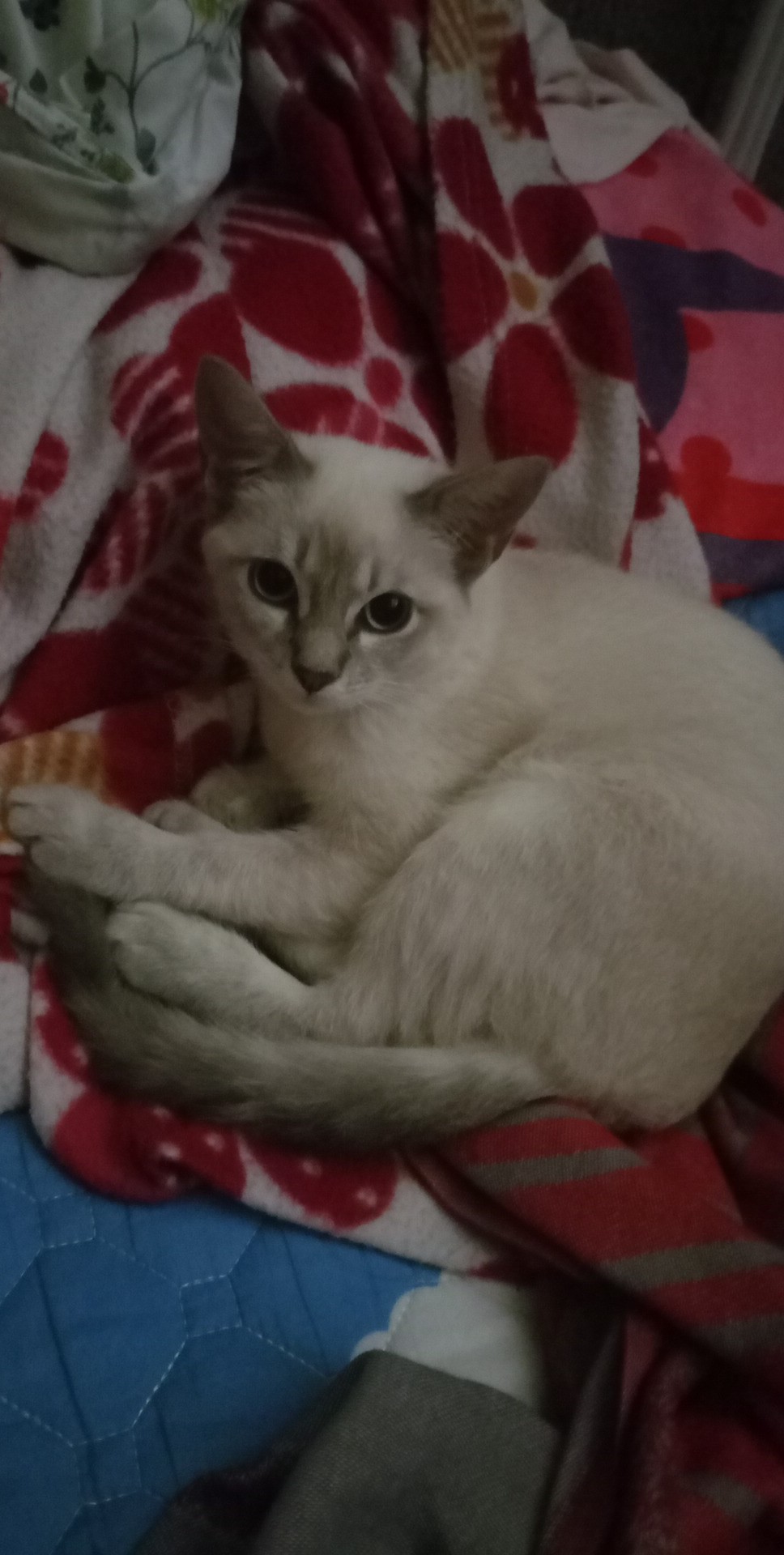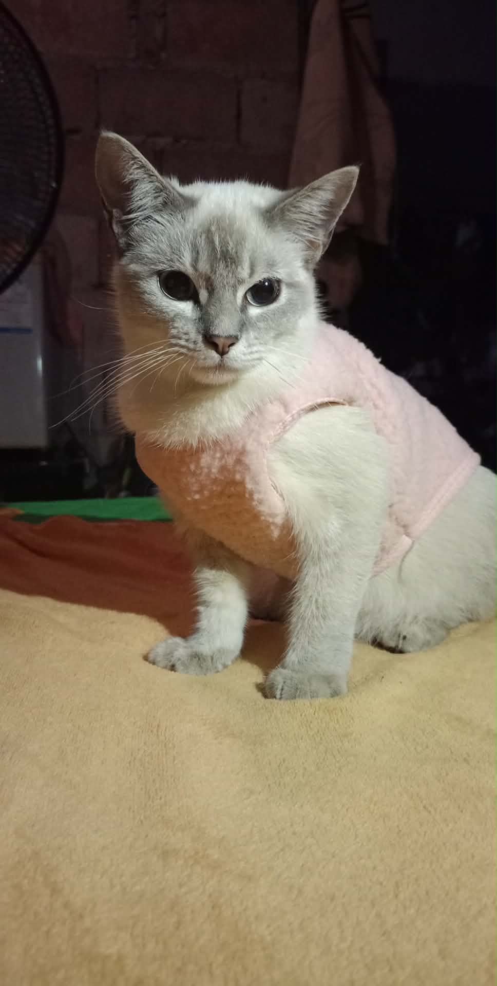 เป็นแมวตัวเมีย อายุ 6 เดือน ตาสีฟ้า วิเชียรมาศ ขนยาวปานกลาง ขนนุ่ม( ไม่มีปลอกคอ )