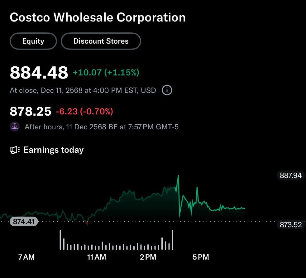 1️⃣ งบออกมาดีกว่าคาดทุกตัว Costco รายงาน EPS ที่ 4.50 ดอลลาร์ สูงกว่าคาดที่ 4.27 ดอลลาร์ และรายได้ 67.31 พันล้านดอลลาร์ ดีกว่านักวิเคราะห์คาดไว้เล็กน้อย สะท้อนความแข็งแรงของดีมานด์ในหมวดอาหารและ non-food แม้เศรษฐกิจผู้บริโภคยังชะลอในหลายเซกเมนต์