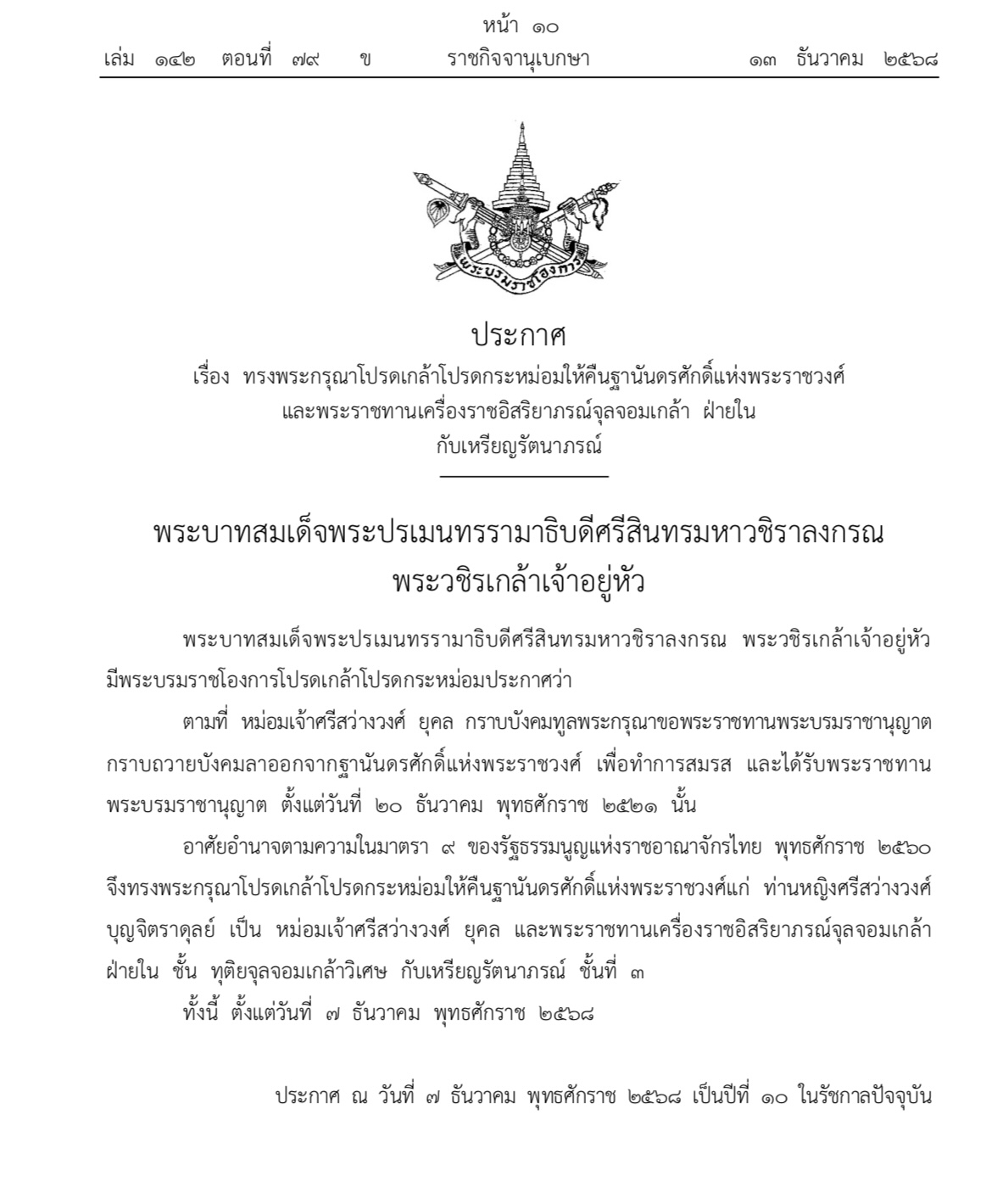 ประกาศ ณ วันที่ 7 ธันวาคม พุทธศักราช 2568 เป็นปีที่ ๑๐ ในรัชกาลปัจจุบัน
