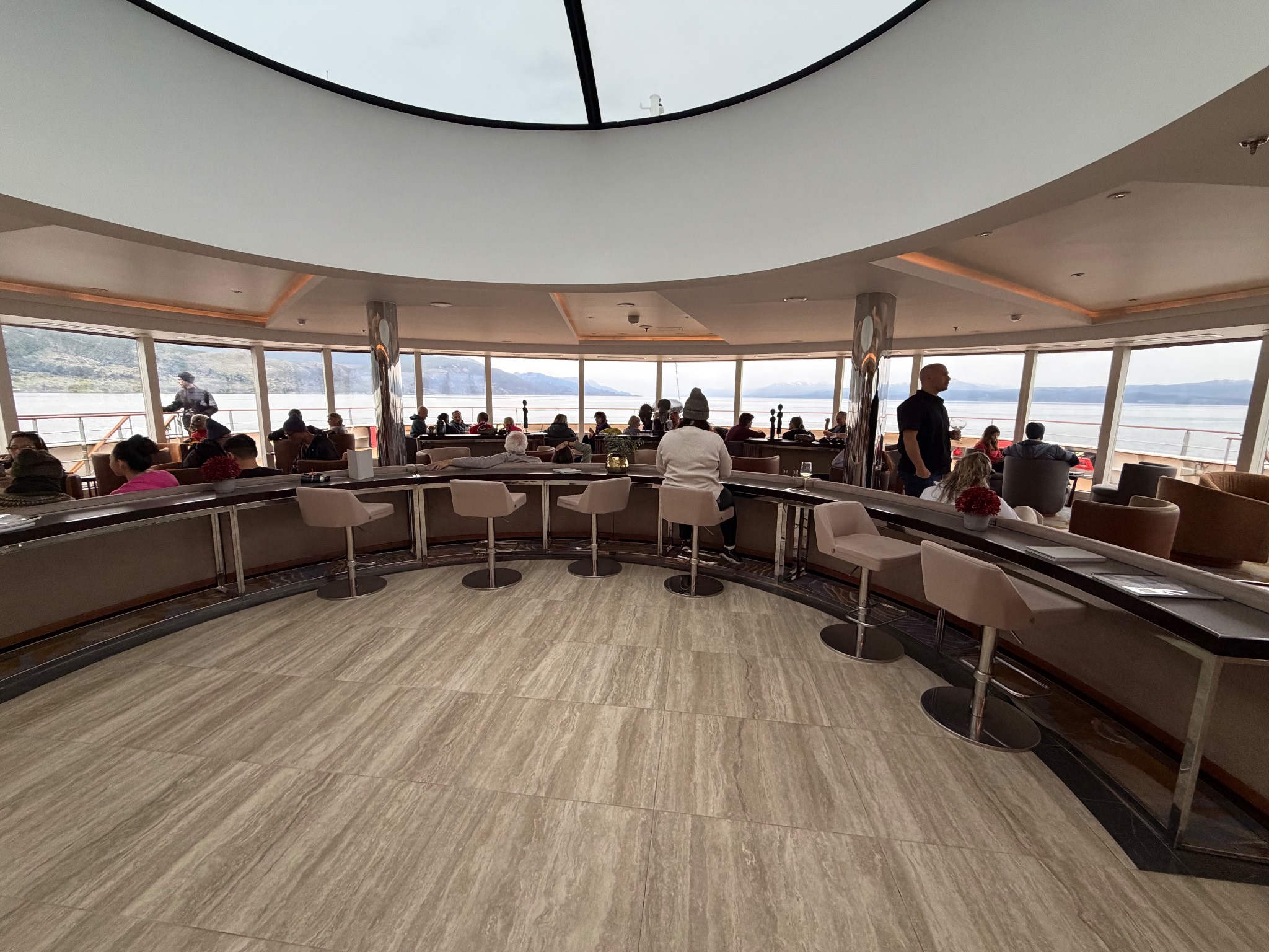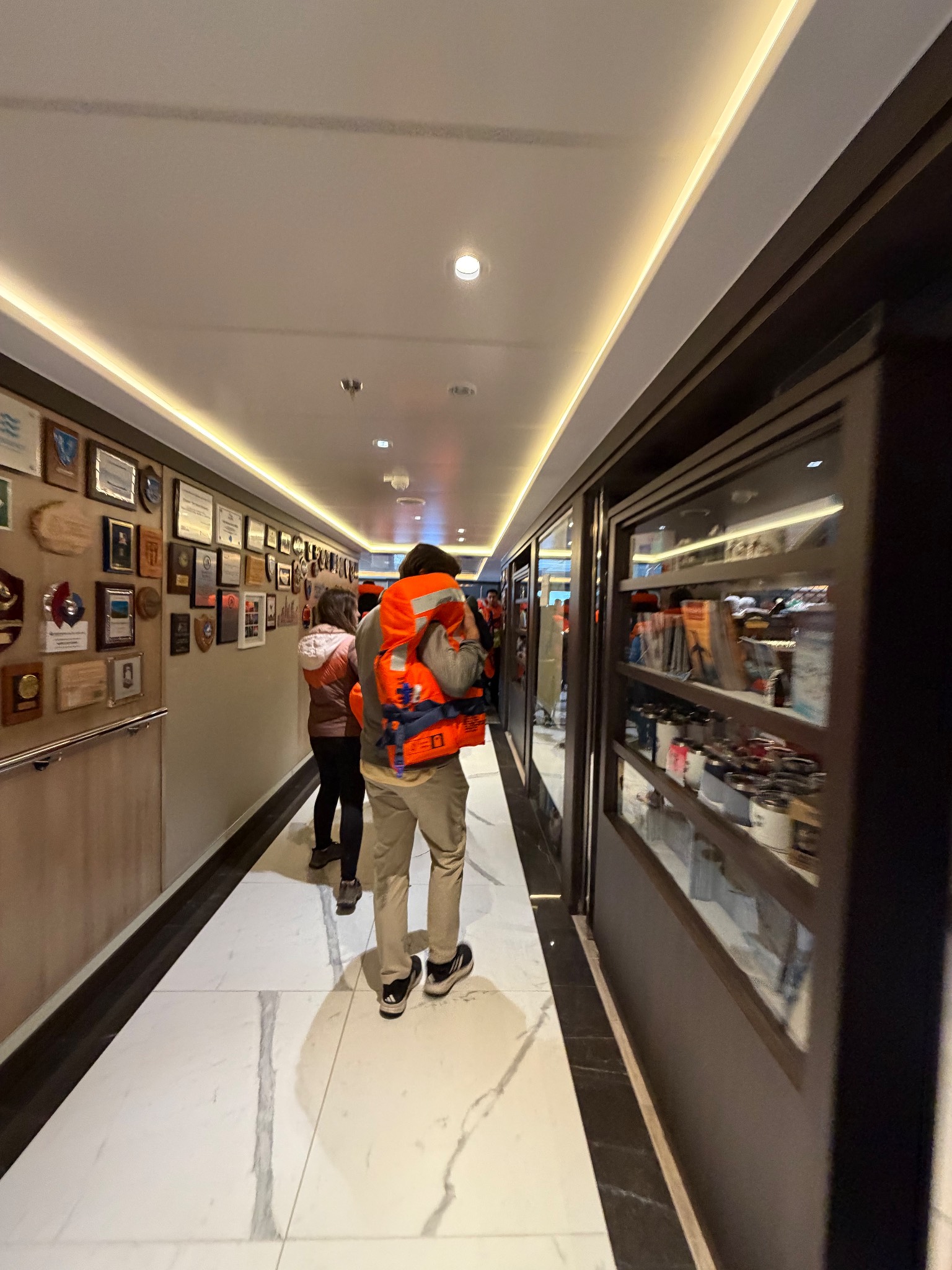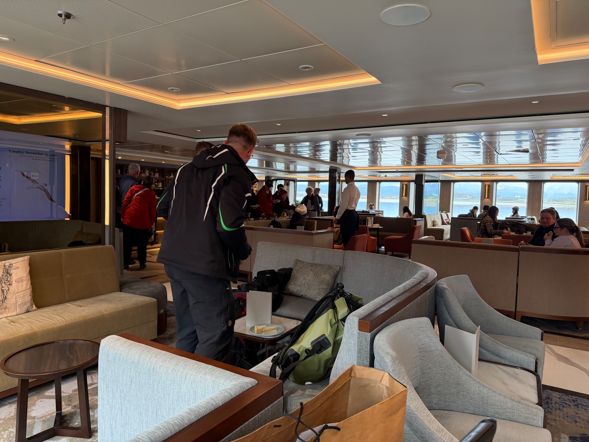 บัสจะนำเราไปยังจุดขึ้นเรือที่ปลายสุดของท่าเรือ ซึ่งทางที่ยื่นออกไปนี้เป็นเขตเฉพาะครับ สำหรับที่จะลงเรือเดินทางไปแอนตาร์กติกาเท่านั้น รถบัสพาเรานำไปส่งที่ปลายทาง และลงบัสพร้อมกับขึ้นเรือ เมื่อก้าวเท้าขึ้นไปที่เรือ ภาพจำของการล่องเรือสำราญที่เคยไปมาครั้งแรก ที่ Alaska ก็กลับมาครับ บอกก่อนว่าตอนแรกไม่คิดเลยว่าเรือ World Explorers จะใหญ่และเรียบหรูได้มากขนาดนี้ เพราะตอนที่จองคิดว่าเป็นเรือผจญภัยที่ต้องล่องแอนตาร์กติกา ต้องแรกคิดว่าลุยๆไม่ได้เน้นหรู แต่กลับทันทีเมื่อก้าวเท้าขึ้นเรือ เน้นการตกแต่ง Luxury มากๆ เจ้าหน้าที่มีการแจกการ์ด เหมือนบัตรประชาชนเราบนเรือ บัตรนี้จะใช้ซื้อของในร้านช็อปบนเรือได้ และอื่นๆ เรานำบัตรไปผูกกับบัตรเครดิตไว้ครับ