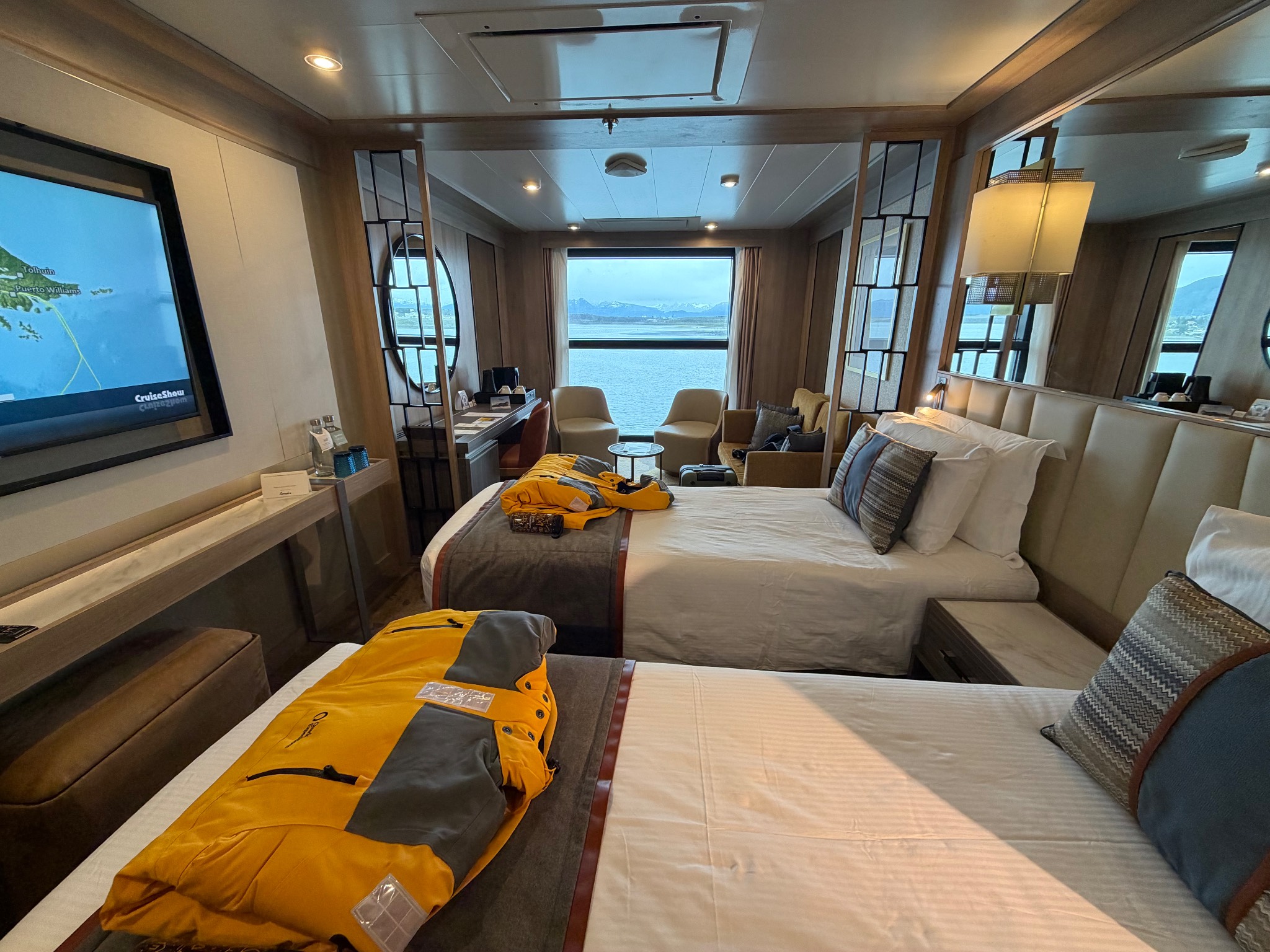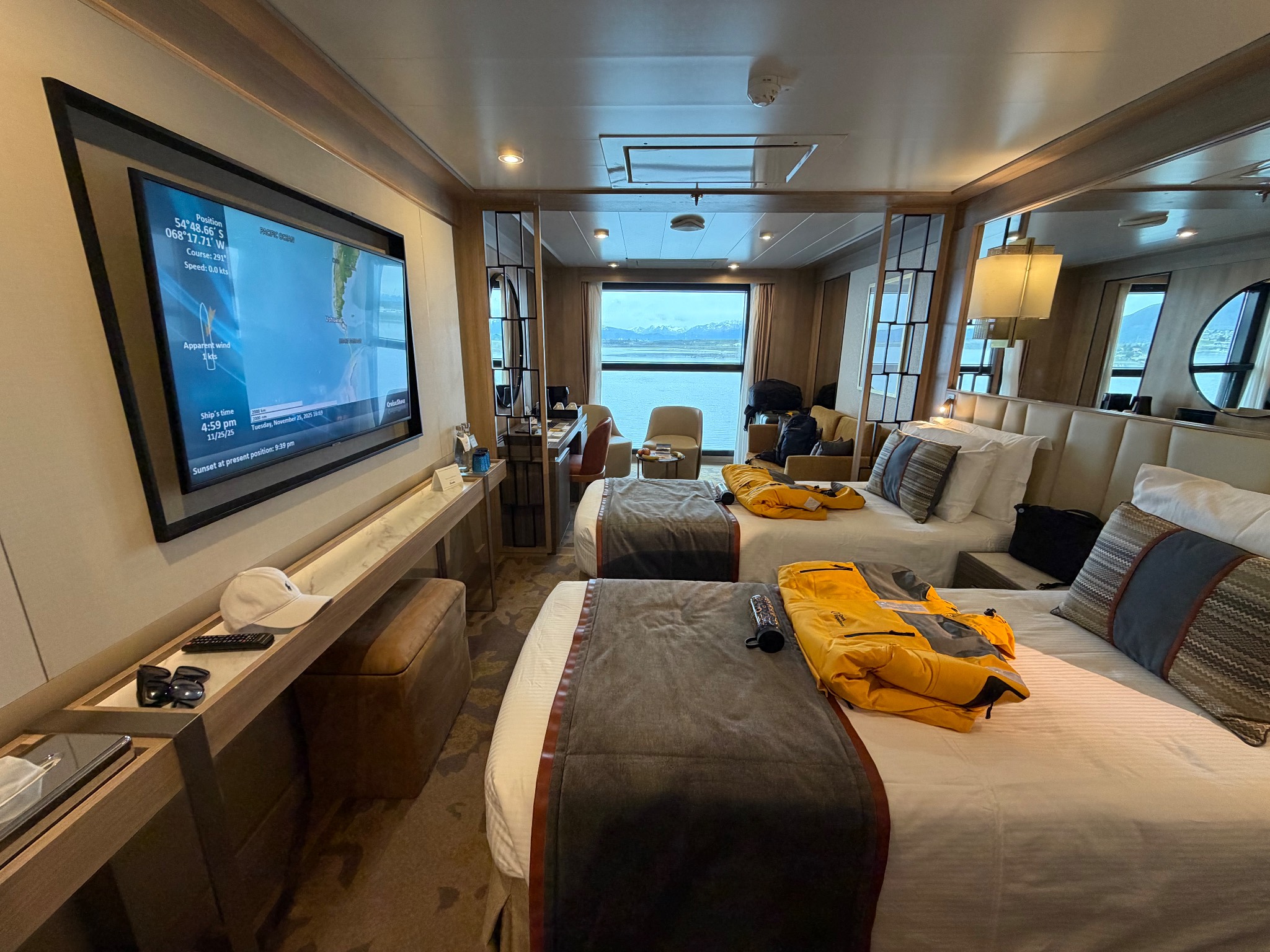 ภายในห้องสวยงาม กว้างขวางมาก ไทด์ห้องผมคือกระจุดสามารถเลื่อนลงมาได้ครึ่งหรือของห้องเลย มันดีมากๆ ผมว่ายังดีกว่าห้องที่มีระเบียงนะครับ เพราะขนาดห้องใหญ่ว่าเพราะลดขนาดระเบียงออกไป ห้องที่มีระเบียงเอาจริงคือเวลาเริ่มเดินทางมันหนาวและลมมาก ไม่สามารถเดินไปนอนเล่นได้จริงหรอกครับ ผมเคยมาแล้วตอนเรือสำราญถ่ายรูปตอนขึ้นเรือแรก หลังๆมาหนาวมากครับ
