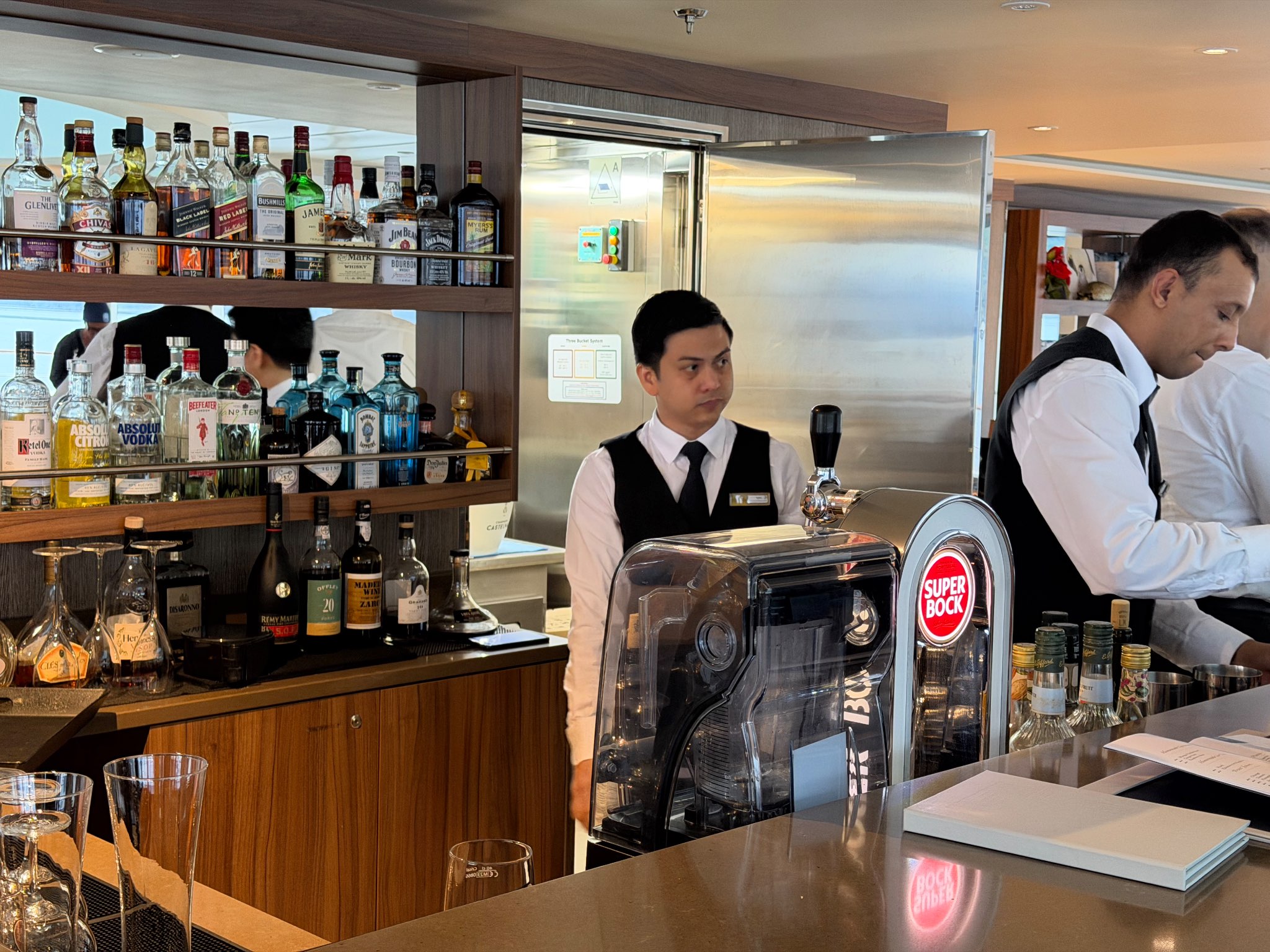 หลังจากนั้นก็ไปที่ห้องรับรอง มีการเครื่องดื่มแบบ Full option มากๆ ไวน์ เหล้า เบียร์ ค็อกเทล พร้อมมาก มีขนมปัง อาหารต่างๆเตรียมบริการอย่างมากมาย เอาให้แบบประทับใจตั้งแต่ตู้มแรกไปเลยว่างั้น เอาล่ะ.... หลังจากที่พักทานของว่างแล้วก็ไปที่ Reception ครับ เพื่อรับการ์ดเข้าห้อง ผมได้ห้องพักชั้น 6 ครับ เป็นชั้นบนสุดของเรือ ที่มีทั้งหมด 7 ชั้น มีสระแช่น้ำอยู่ชั้นบนสุด