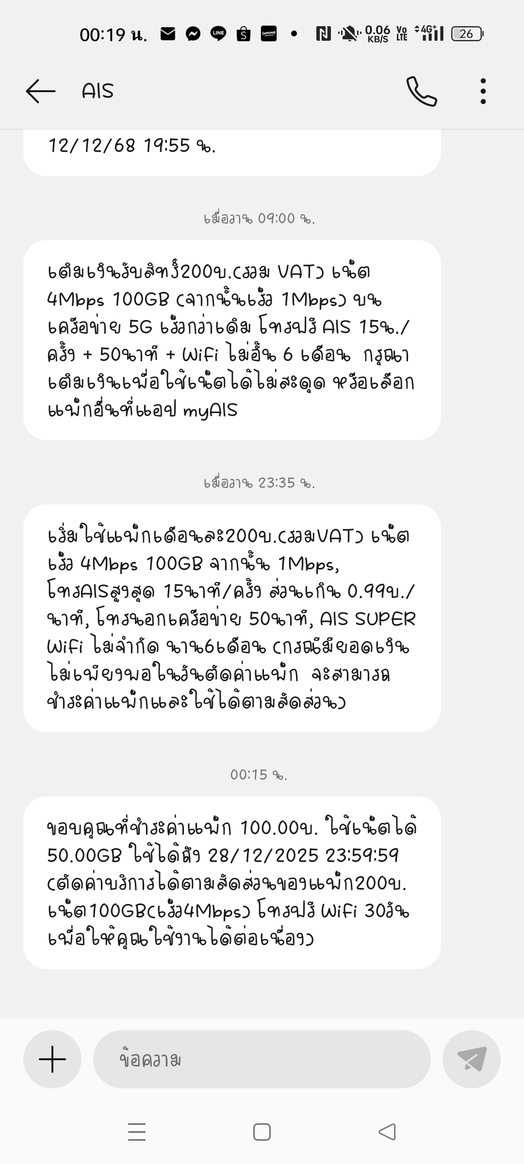 จากข้างต้นเลยค่ะเรื่องการขอคืนเงิน อยู่ๆเอไอเอสก็ขึ้นข้อความค่ะว่าเราได้สมัครแพ็กเกจเสริม 100 ลาท แล้วเราได้ทำการยกเลิกไปแล้วค่ะแต่เราอยากจะทราบว่า เราพอจะมีหนทางได้เงินคืนมั้วคะ ตอนนี้ หัวเสียมาก ทำไมอยู่ๆเอไอเอสกล้ามาหักบองเรา ทั้งๆที่เราก็ไม่ได้สมัคร แต่กลับต้องเสีย 100 ไปฟรีๆ