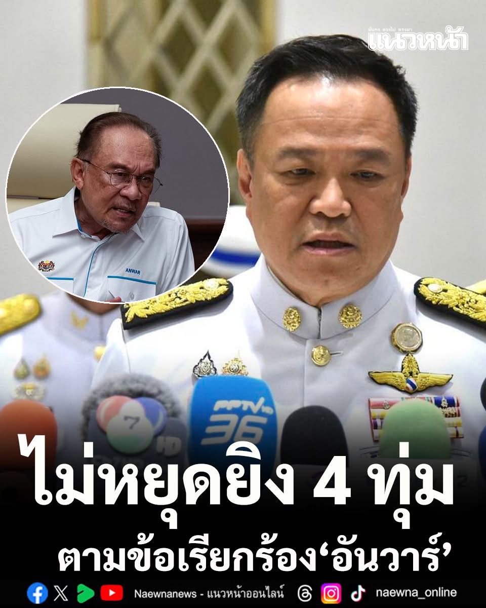 นายกฯ" ยัน ไม่หยุดยิง 4 ทุ่ม ตามข้อเรียกร้อง”อันวาร์" จี้ “กัมพูชา“แสดงความจริงใจ เสนอข้อดำเนินการมาที่ไทย ไม่ใช่ให้ผู้นำประเทศอื่นมาพูด ย้ำคนไทยมีสิทธิ์กลับบ้าน อย่าเอาประชาชนมาเป็นตัวประกัน ด้าน เสธ.ทบ. ไล่ไปถามครอบครัวทหารที่เสียชีวิต ว่าเป็นอย่างไร