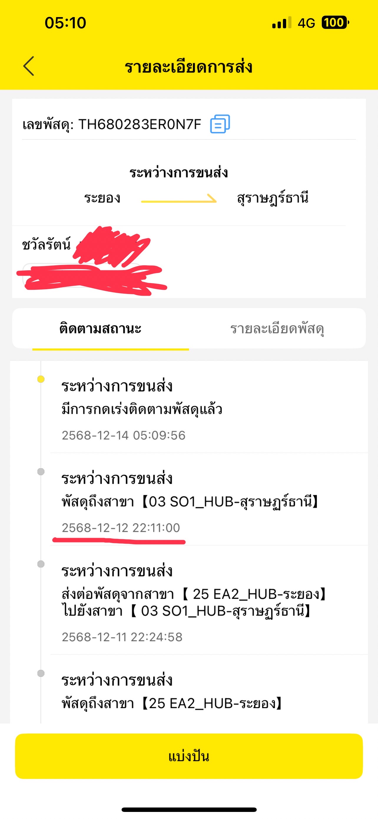 ปกติสาขา มาที่ ใช้เวลาไม่เกิน1วัน นานสุดแค่1วันเท่านั้น แต่ตอนนี่3-4วันยังไม่ถึง หรือไม่ก็ถึงแล้วแต่ไม่อัพเดทสถานะพัสดุหรือป่าว ไม่รู้ว่าจริงๆแล้วพัสดุอยู่ตัวเองที่ไหน ถึงหาดใหญ่แล้วหรือยังอยู่สุราษ