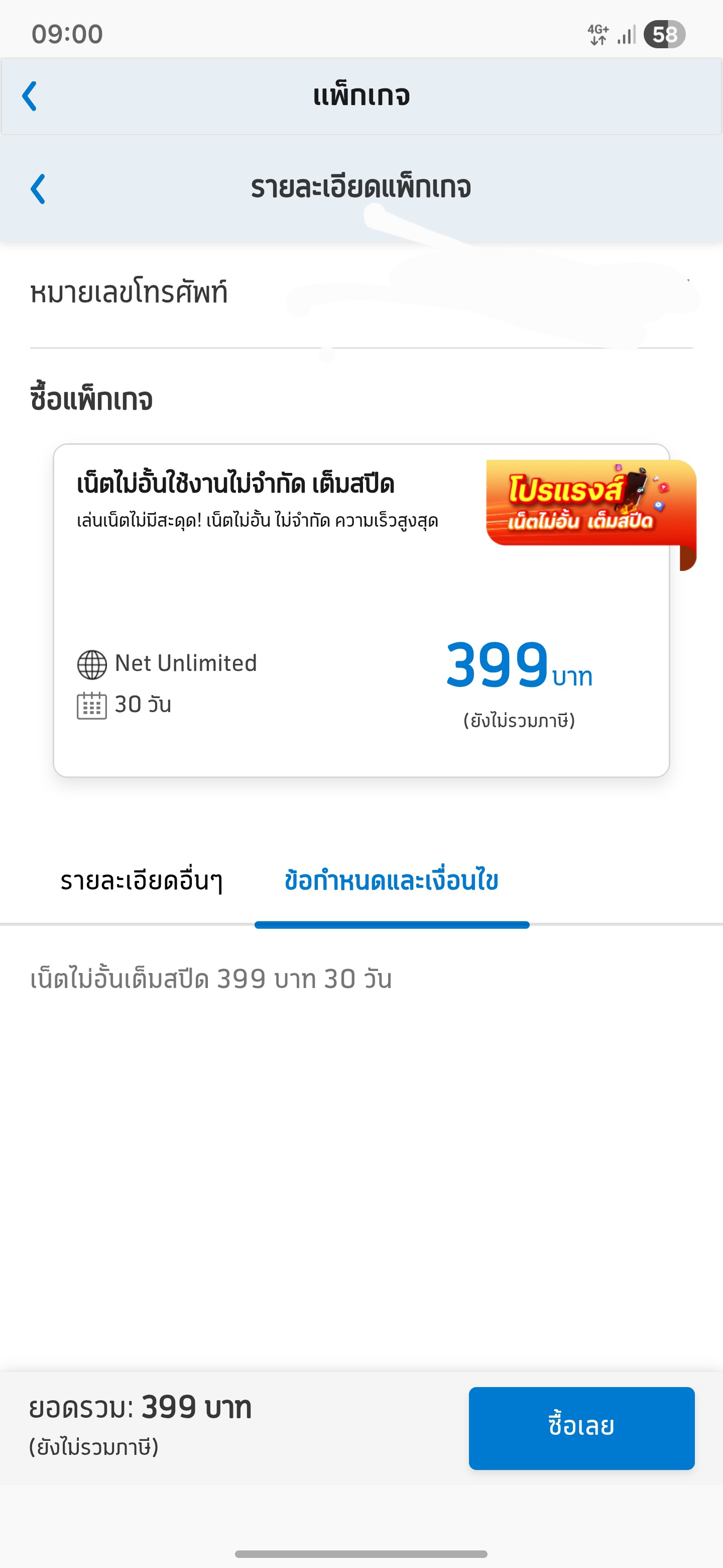 แพ็กเกจเสริม เน็ตไม่อั้นใช้งานไม่จำกัด เต็มสปีด ต่ออัตโนมัติ 399 บาท