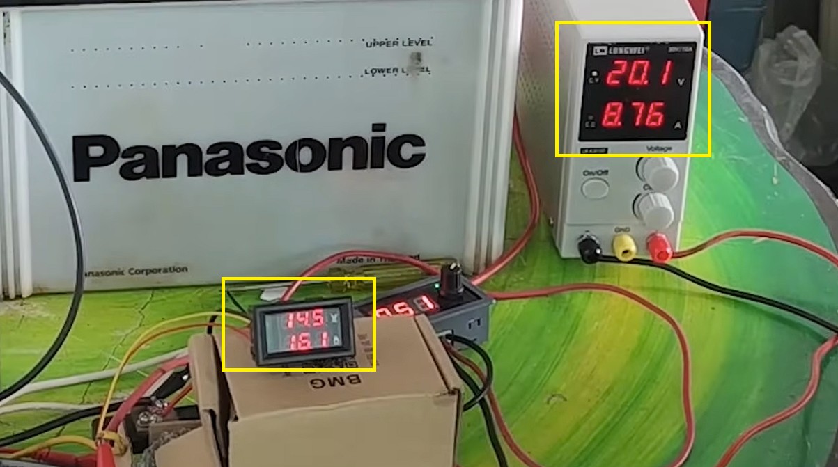 ถ้าผมจะลองทำตามวีดิโอที่สอน ผมเข้าใจว่าสีเปลี่ยมล่างคือมิเตอร์ที่วัดแรงดันที่ขั้วแบตกับกระแสที่ไหลเข้าแบต ส่วนสีเหลี่ยมบนคือแรงดันที่DC supply จ่ายออกมาและกระแสที่ DC supply จ่ายออกไป