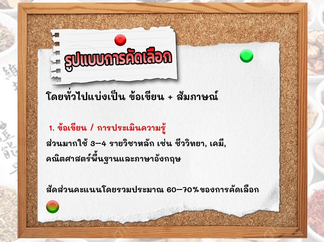เตรียมตัวสอบติดแพทย์และเภสัชอย่างมั่นใจด้วยข้อมูลจากประสบการณ์จริง รุ่นพี่ที่สอบติดได้ถ่ายทอดขั้นตอนการสอบทั้งข้อเขียนและการสัมภาษณ์แบบละเอียด เพื่อให้ผู้สมัครเข้าใจภาพรวมของข้อสอบและการประเมินอย่างเป