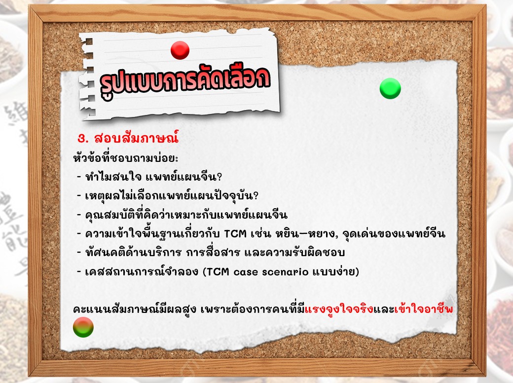 เน้นสัมภาษณ์: เตรียมคำตอบสัมภาษณ์ให้ชัดเจน เช่น "เหตุผลเลือกแพทย์จีน" และ "เป้าหมายอาชีพ"