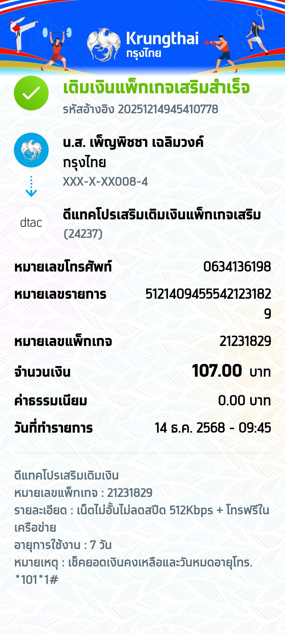 เติมแพ็คเกจดีแทคในแอปกรุงไทยแต่ไม่เข้าเงินในบัญชีหักไปแล้ว