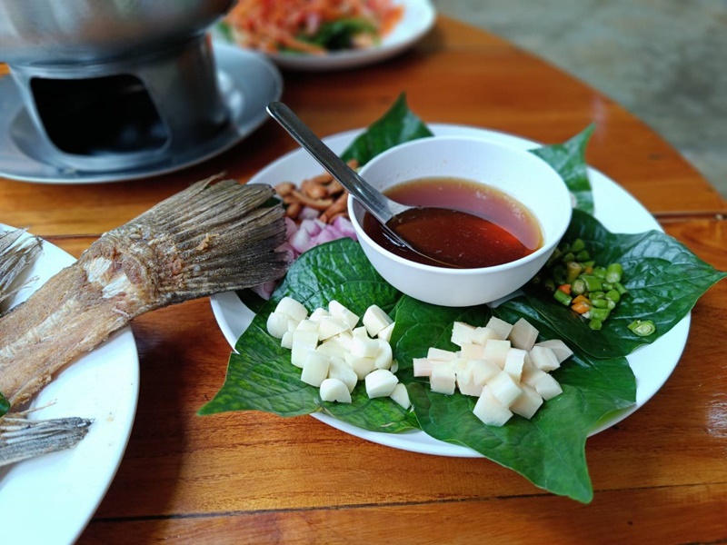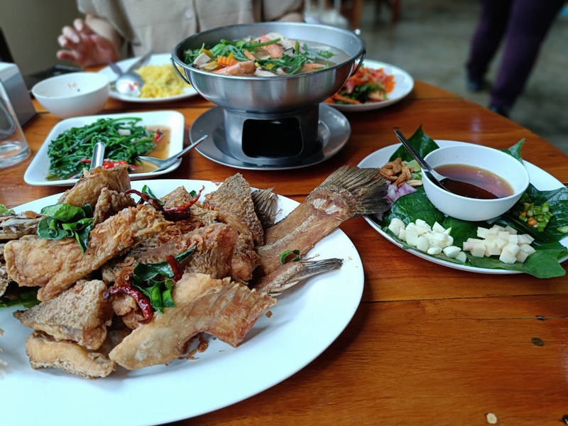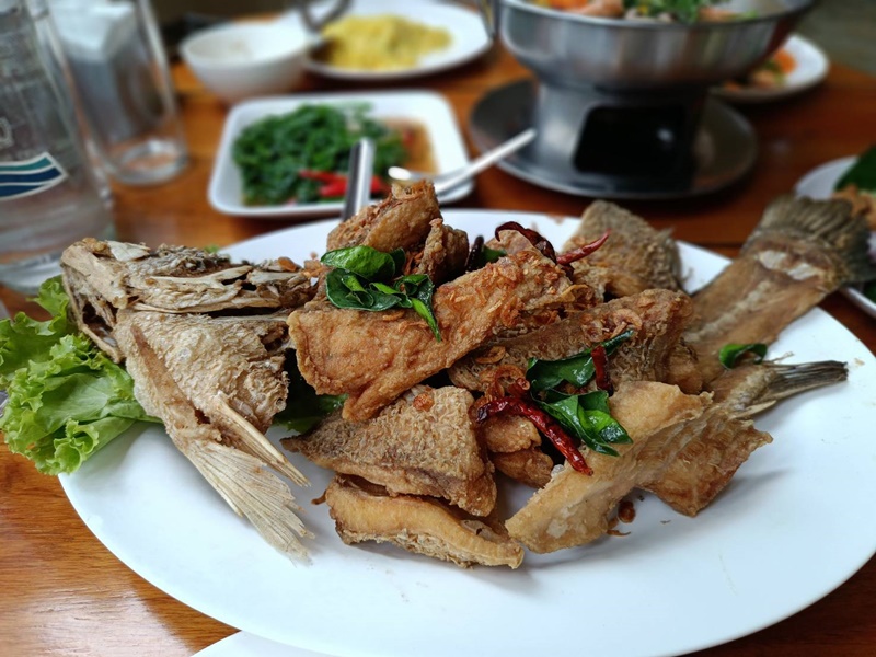 แกงเลียงกุ้งสด(ใหญ่) ปลากะพงสมุนไพร ผัดผักกูดไฟแดง ผัดไทยกุ้งสด(เล็ก) ส้มตำผักกูด(ใหญ่) ข้าวผัดขมิ้น