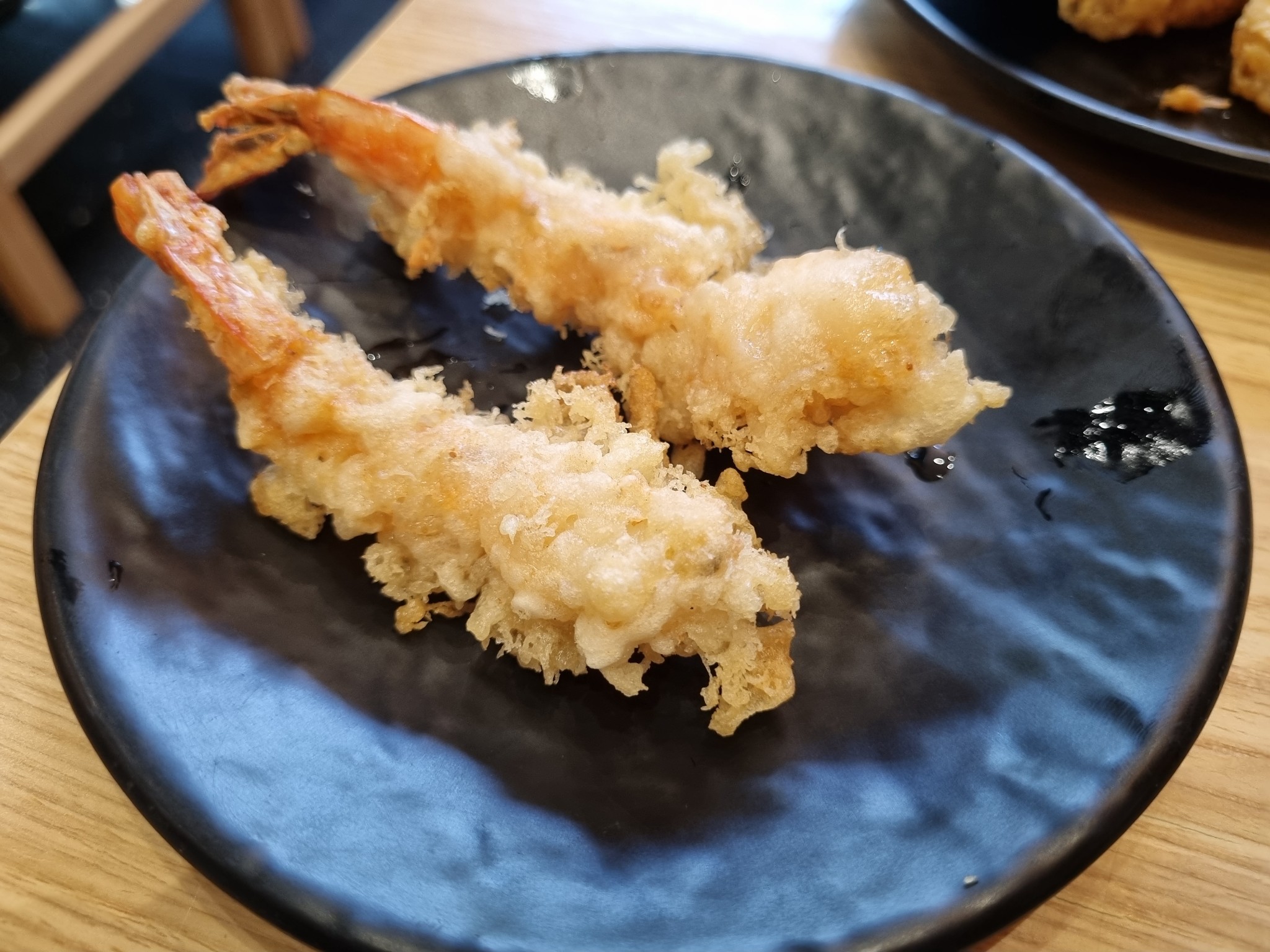 กุ้งเทมปุระ แป้งน่ะกรอบดีอยู่ แต่เนื้อกุ้งแข็งและเหนียวเป็นยางเลย หายนะมากอันนี้