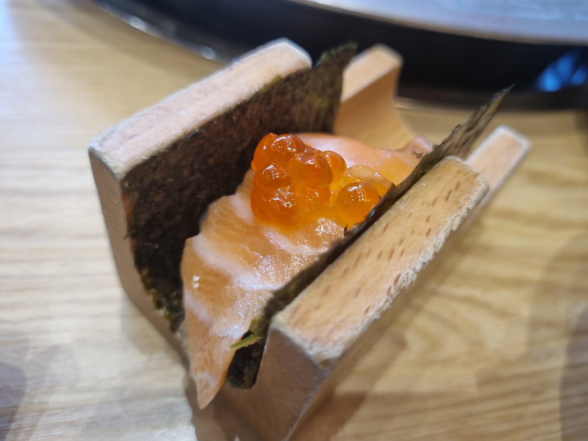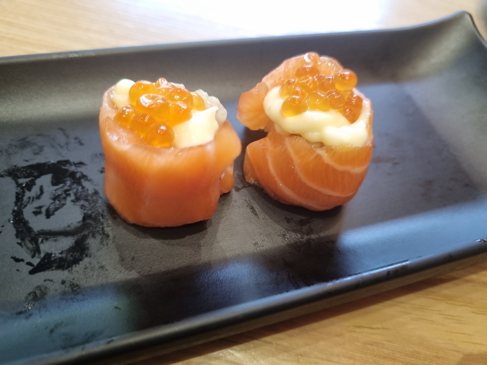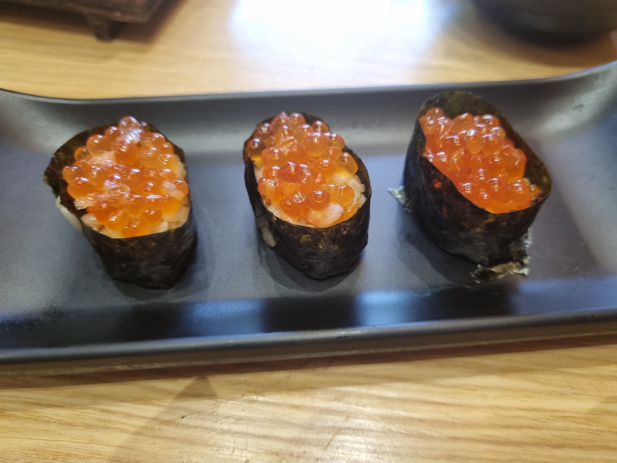 อิกุระแซลมอนโรล ซอสออกเปรี้ยวกว่าชิ้นอื่น ส่วนเนื้อปลากับไข่ก็รสชาติปกตินะ
