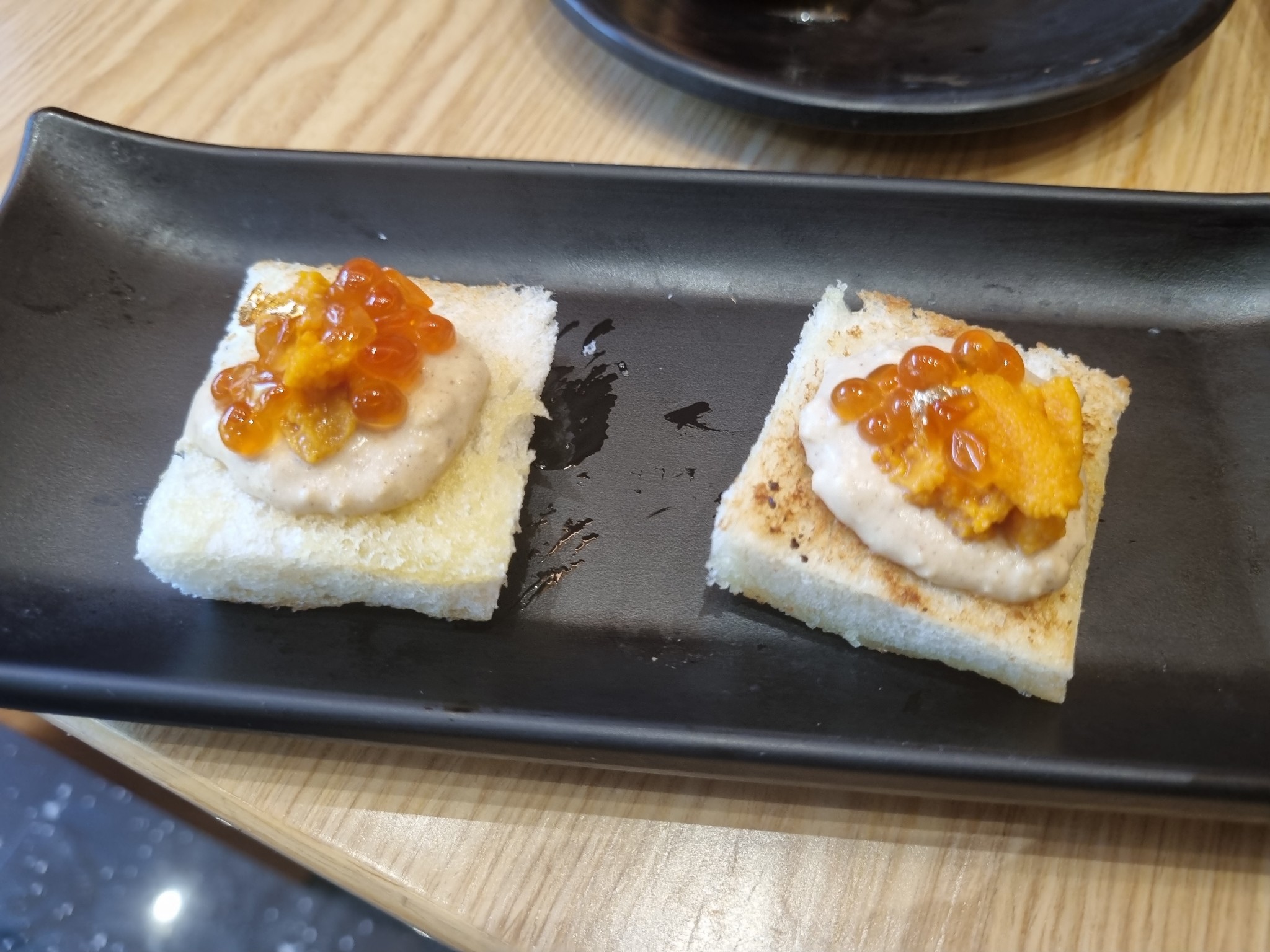 อูนิอิกุระโทสต์ มาแบบสวยงามเหมือนพวกอาหารงานค็อกเทล ได้ความมันและหอมของทรัฟเฟิลครีม กับความขมสดของไข่หอยเม่น