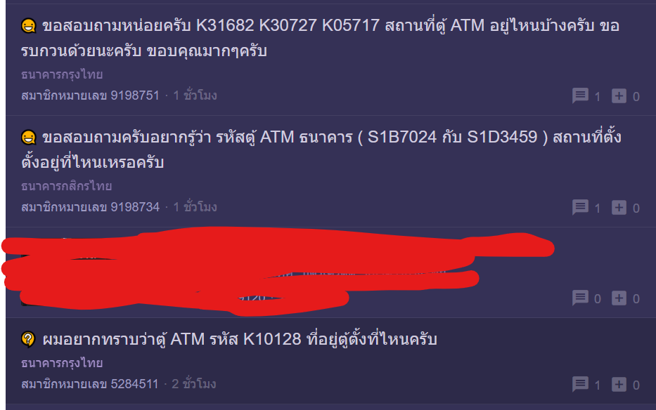 เห็นกระทู้สอบถามที่ตั้งตู้ATM เหมือนๆกันในเวลาใกล้เคียงกัน แต่เลขสมาชิกไม่เหมือนกัน เลยอดแปลกใจไม่ได้ ว่าคน 3 คนอยากจะสอบถามหมายเลขตู้ ATM พร้อมๆกันใกล้เคียงทำไม หรืออาจจะเป็นคนๆเดียว มีหลายล็อคอิน