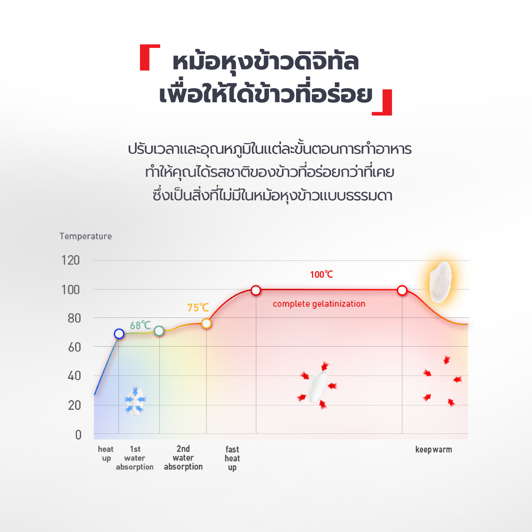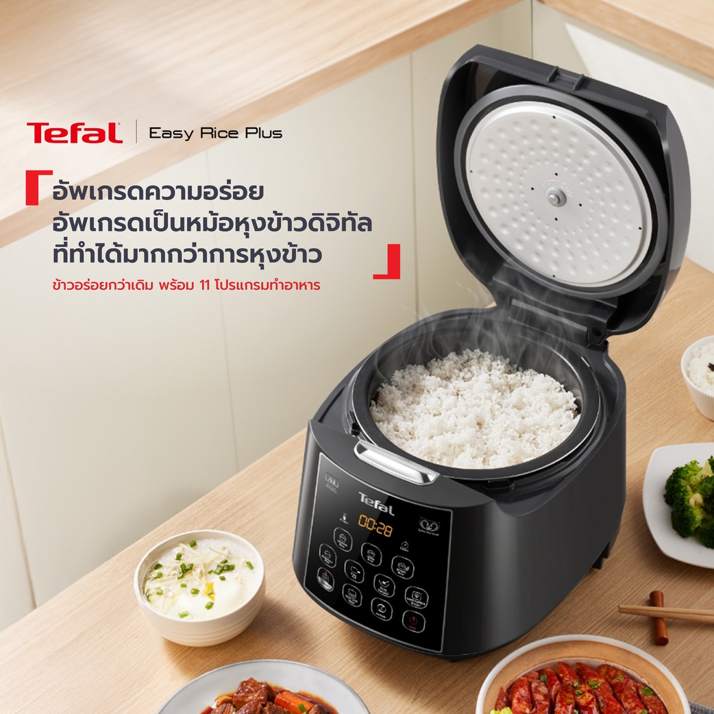 หม้อหุงข้าว Tefal RK736B66 1.8 ลิตร รุ่น EASY RICE PLUS เหมาะกับบ้านที่อยากได้ข้าวสุกนุ่มทั่วหม้อแบบไม่ต้องคุมไฟเอง เพราะมี AI ช่วยปรับเวลาและอุณหภูมิอัตโนมัติ ความจุ 1.8L หุงได้สูงสุด 10 ถ้วย กำลังไฟ 750W ตั้งเวลาหุงล่วงหน้าได้ 12 ชม และอุ่นอัตโนมัติต่อเนื่องอีก 12 ชม ทำให้ตารางชีวิตแน่นแค่ไหนก็ยังมีข้าวพร้อมกิน