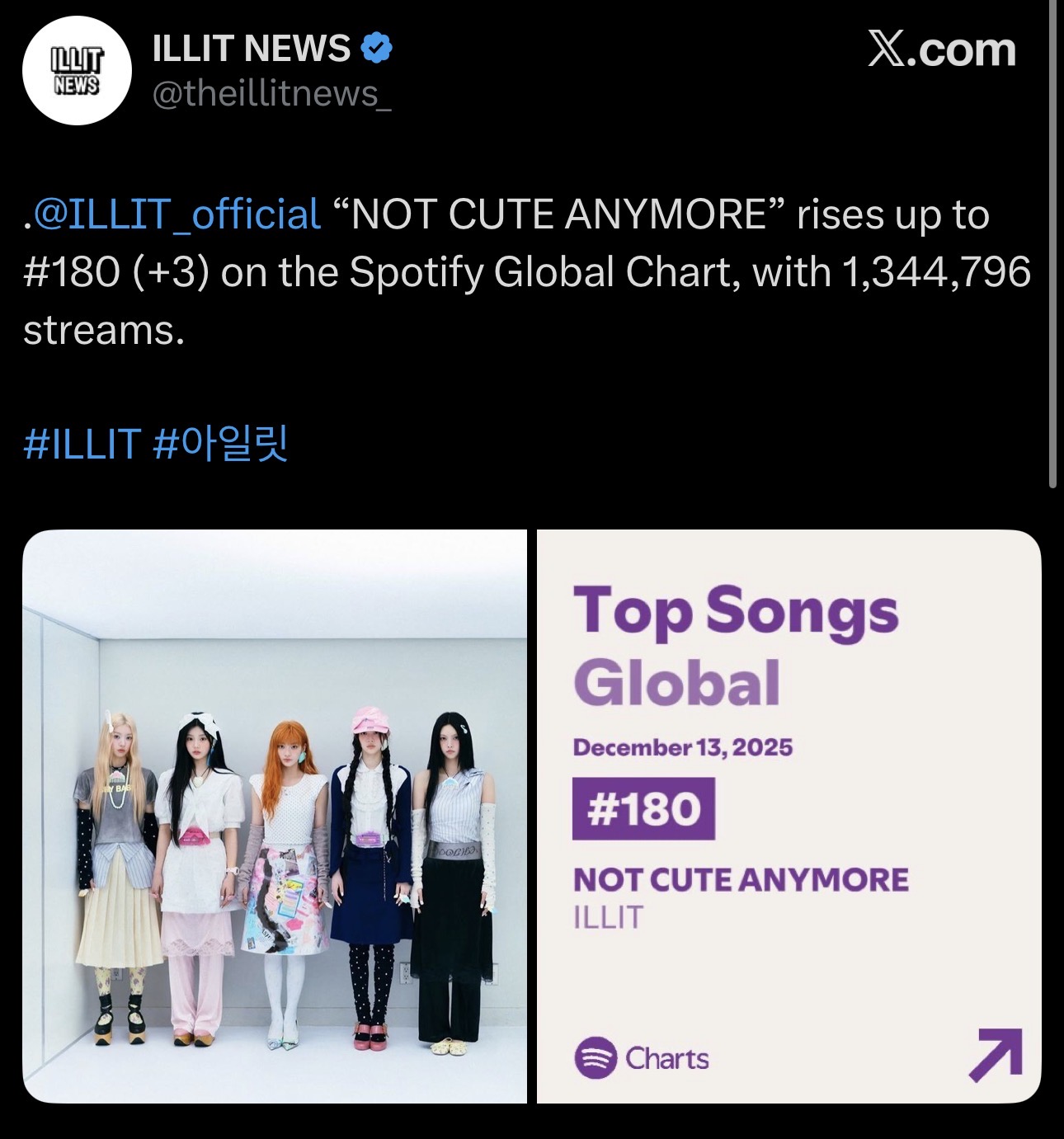 ฝั่งสตรีมมิ่งก็ปังไม่แพ้กัน เพราะ Spotify Global ของ “NOT CUTE ANYMORE” ก็ขึ้น new peak แม้เป็นชาร์ตวันเสาร์อาทิตย์ และทั้งที่ช่วงนี้เป็นดงเพลงคริสต์มาส มีแต่เพลงฮิตระดับโลกเต็มชาร์ต แต่ ILLIT ก็ยังฝ่าเข้าไปได้