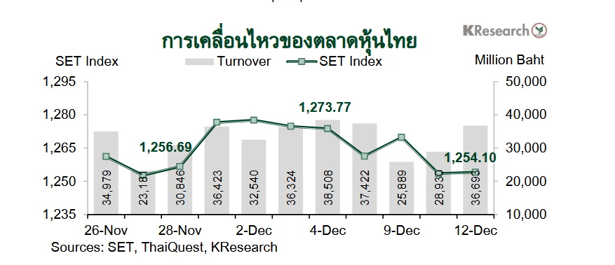 ดัชนีหุ้นไทยมีแนวรับที่ 1,245 และ 1,230 จุด ขณะที่แนวต้านอยู่ที่ 1,285 และ 1,305 จุด ตามลำดับ โดยศูนย์วิจัยกสิกรไทยประเมินปัจจัยสำคัญที่ต้องติดตาม ได้แก่ การประชุมกนง. (17 ธ.ค.) ประเด็นการเมืองในประเทศ สถานการณ์ชายแดนไทย-กัมพูชา รวมถึงทิศทางเงินทุนต่างชาติ