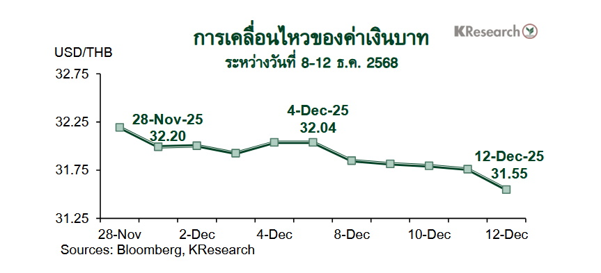 สำหรับสัปดาห์ระหว่างวันที่ 15-19 ธ.ค. 2568 ธนาคารกสิกรไทยมองกรอบการเคลื่อนไหวของค่าเงินบาทที่ระดับ 31.40-32.00 บาทต่อดอลลาร์ฯ ขณะที่ศูนย์วิจัยกสิกรไทยประเมินปัจจัยสำคัญที่ต้องติดตาม ได้แก่ ผลการประชุมกนง. (17 ธ.ค.) ถ้อยแถลงของเจ้าหน้าที่เฟด ทิศทางฟันด์โฟลว์ของต่างชาติ ทิศทางค่าเงินเอเชียและราคาทองคำในตลาดโลก ปัจจัยการเมืองในประเทศ รวมถึงสถานการณ์ระหว่างไทย-กัมพูชา
