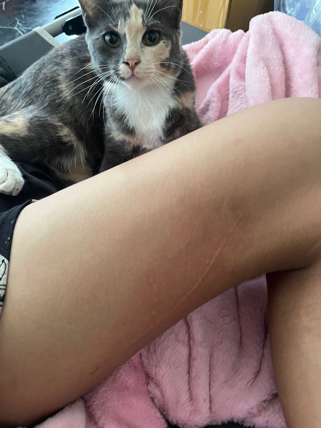 ตื่นเช้ามารู้สึกแสบๆที่ต้นขา พอก้มดูเจอแผล ยาวมาก ยาวเท่าขวดไวตามิ้ลได้ แล้วมีแมวตัวนึงมานอนอยู่ข้างๆ คือแผลมันยาวมาก เลยคิดว่าแมวไม่น่าทำแบบนี้ได้ ใช่แมวทำรึป่าว