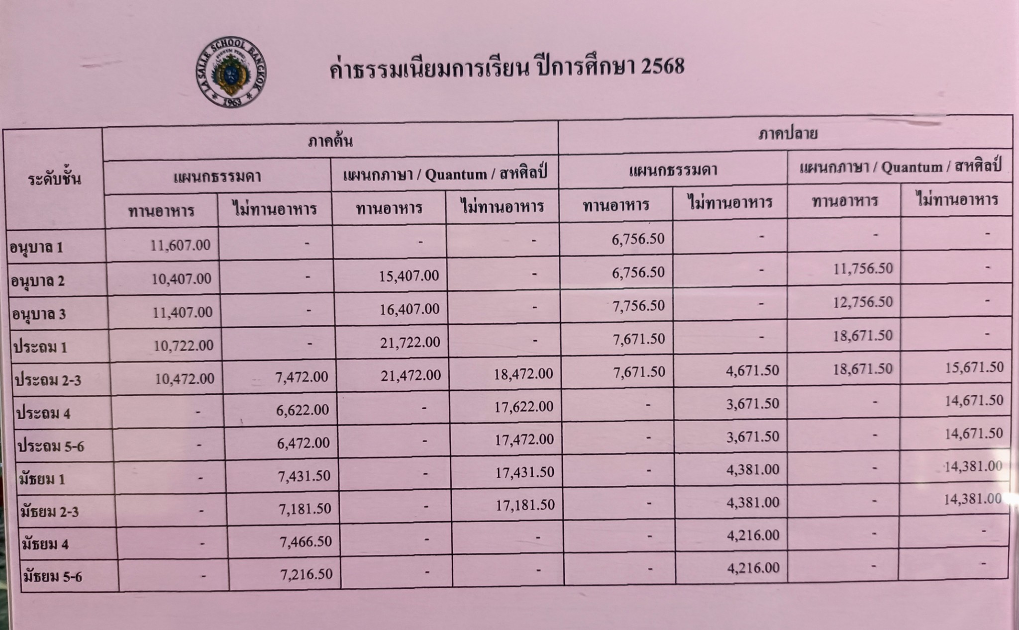 ปล. หลักสูตรเข้มข้น ค่าเทอม เพิ่มอีก 10,000 บาท แต่ เปิดให้เฉพาะเด็กลูกหม้อที่จบมาจาก อ.3 ลาซาล เท่านั้น ( เด็กที่จบ อ.3 จากที่อื่นไม่สามารถเรียนหลักสูตรเข้มข้นได้ )