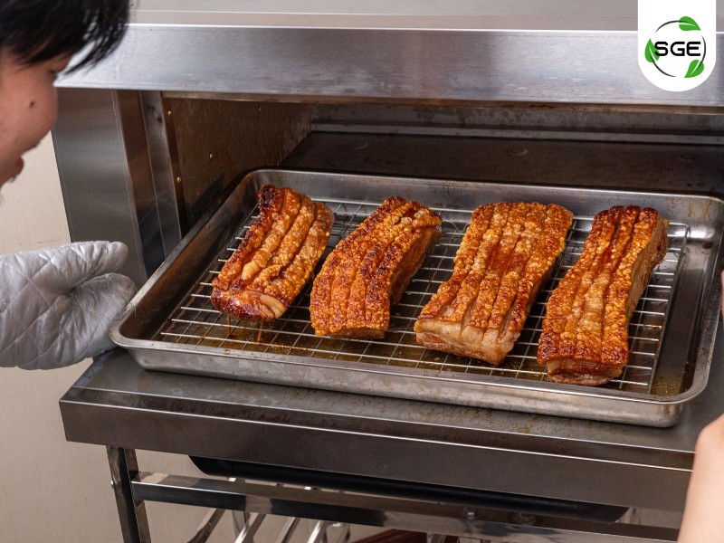 เมื่อครบเวลาแล้วนำไปเข้า ตู้อบลอมร้อน ที่อุณหภูมิ 90°C ประมาณ 2–4 ชั่วโมง (ตามขนาดชิ้นเนื้อ) จนหนังมีแห้งสนิทและมีความใสขึ้นนะะะ