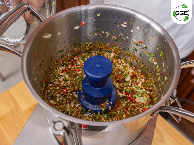 เตรียมทำน้ำจิ้มซีฟู้ดโดยใช้เครื่องปั่นพริก ปั่นพริกแดงจินดา กระเทียม รากผักชี น้ำตาลปี๊บ น้ำปลา น้ำมะนาว และน้ำเปล่า ให้ส่วนผสมเข้ากันดีเลยนะะ