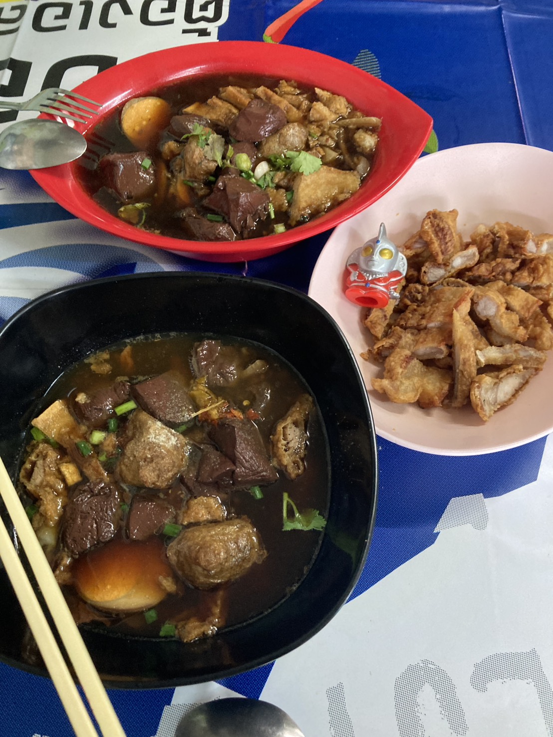 สีแดงคือพิเศษไม่ต้องบอกก็รู้นะคะ ว่าใครกิน ของใคร ชามดำคือธรรมดา น้องจะกินหมูกรอบ เลยสั่งเพิ่มค่ะ