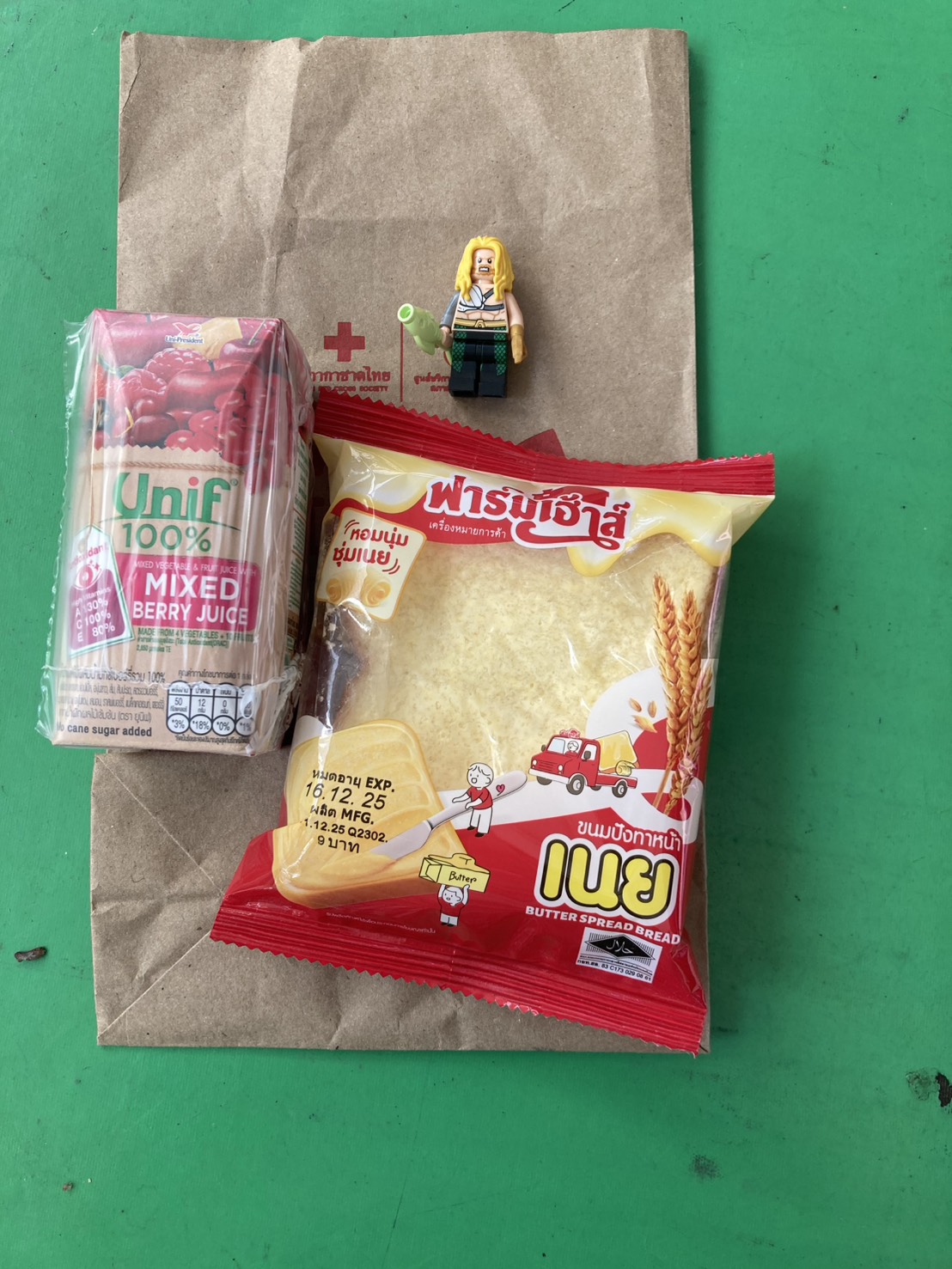 บริจาคเลือดแล้วมานั่งรอน้องไปห้องน้ำ มีขนมปังกับน้ำผลไม้ให้กินหลังบริจาคเลือด กัมบอลไม่ได้กินขนม น้องกินคนเดียว