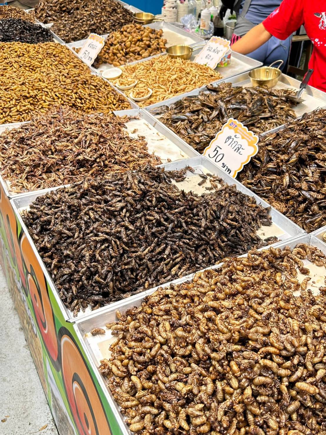 เดินหาของกินเจอแมลง ตอนแรกว่าจะซื้อ แต่แพงมากตักละ ไม่ใช่สีทองๆที่ตักนะคะ ถ้วยเล็กๆที่เห็นนั่นต่างหาก ไม่กินแหละ