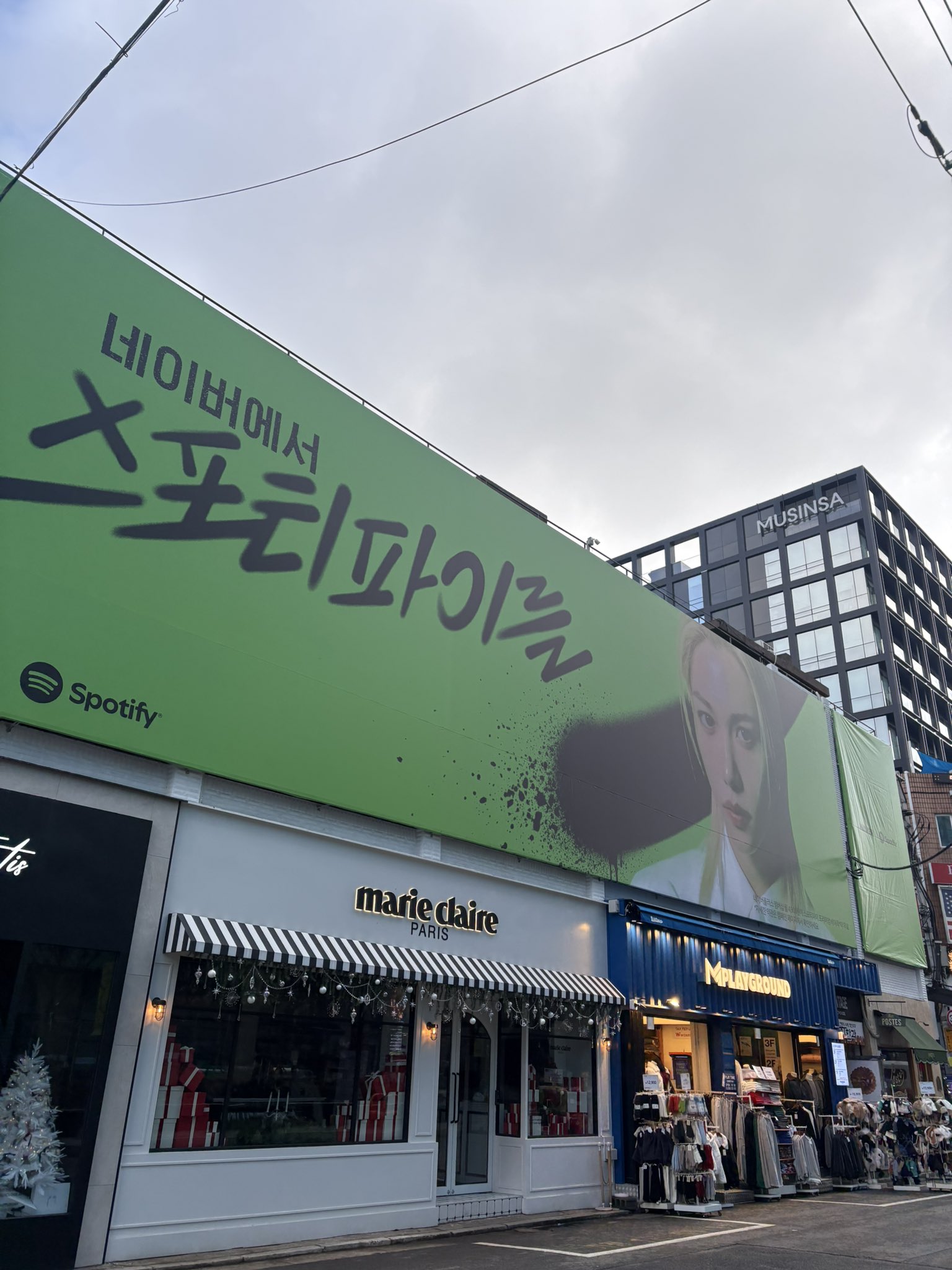 พบเห็นป้ายโฆษณาขนาดใหญ่ของแคมเปญ “Spotify on Naver” ณ ทางออกที่ 3 สถานีซองซู อาคารร้านแฟล็กชิปสโตร์ Maison Marie Claire