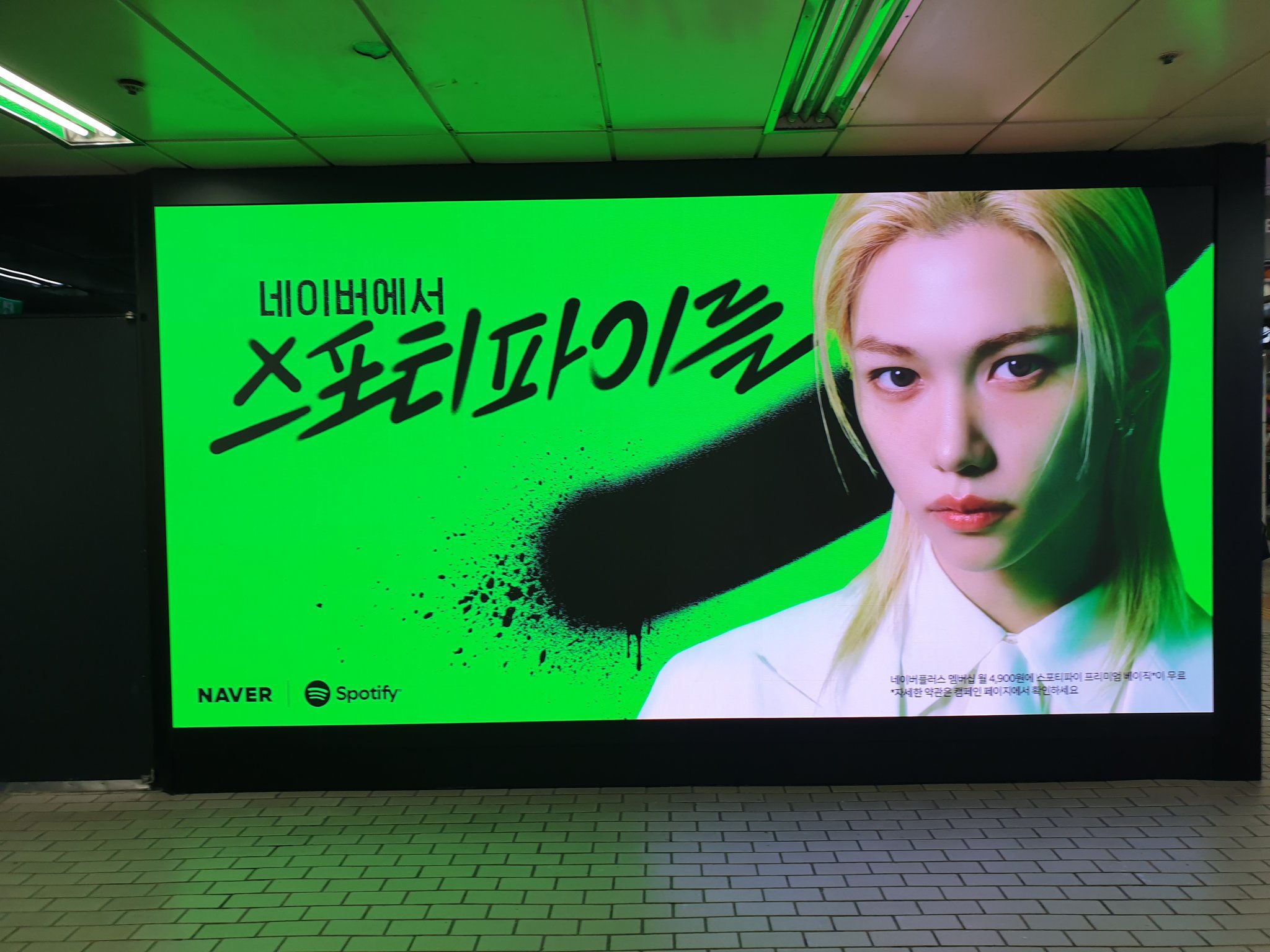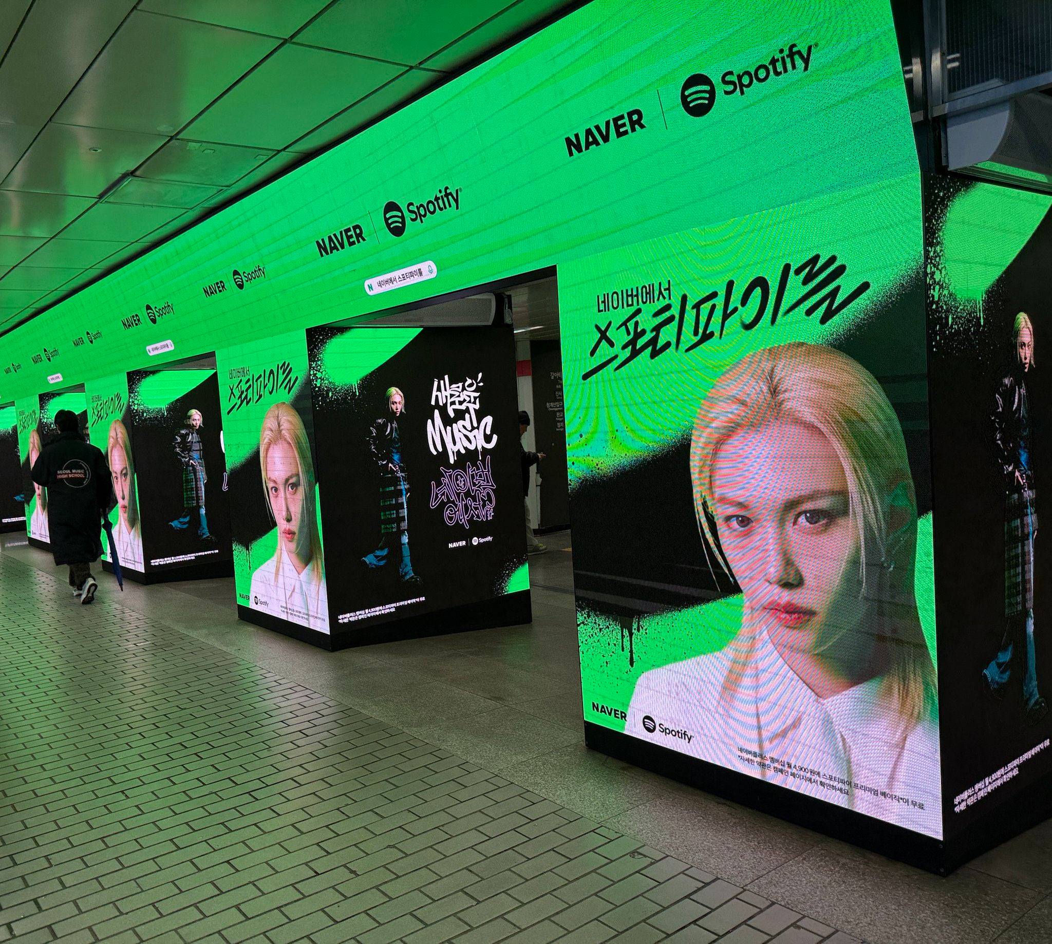 แคมเปญ “Spotify on Naver” ถูกพบเห็นที่ป้ายโฆษณภายในสถานีซองซู
