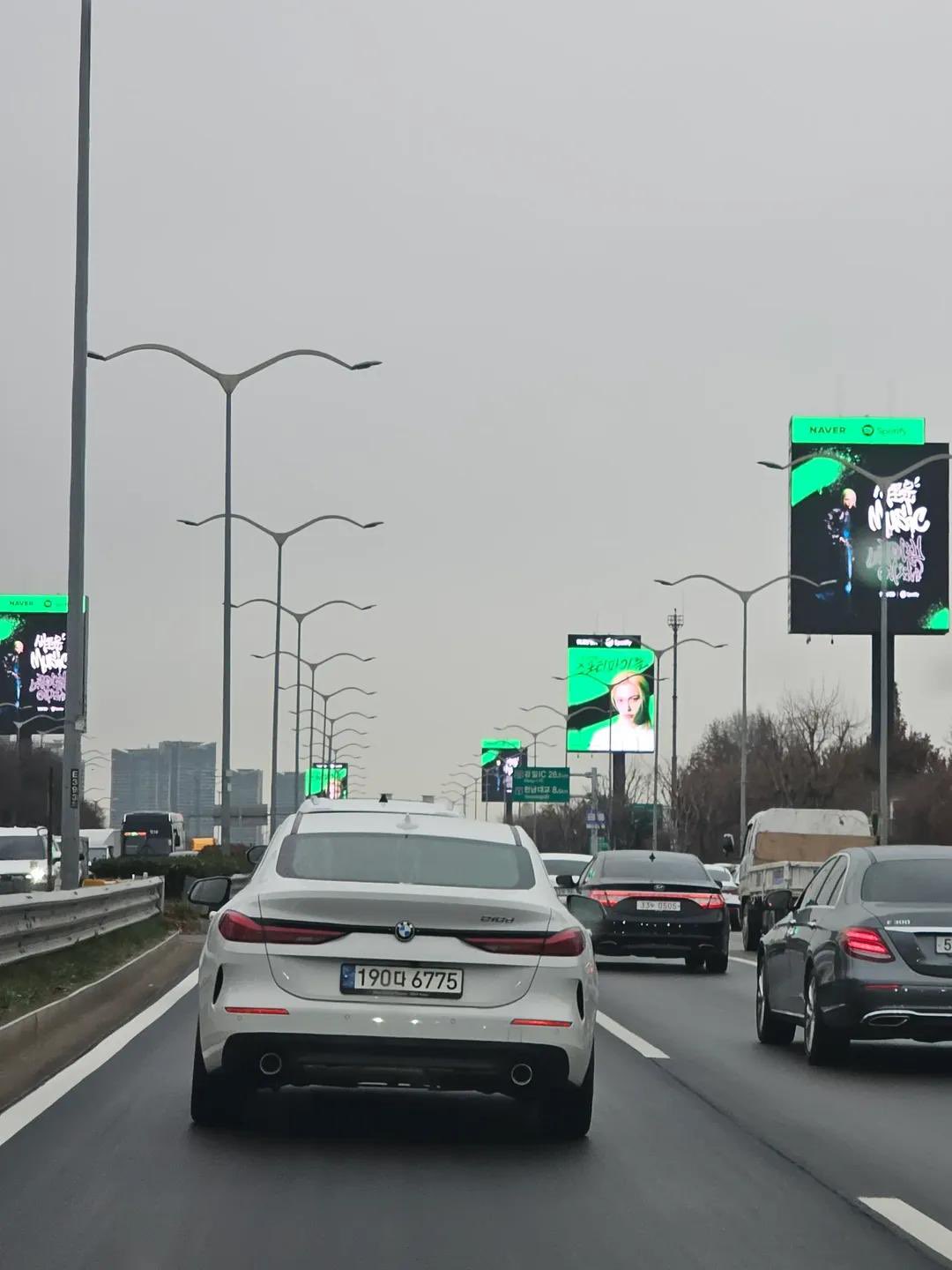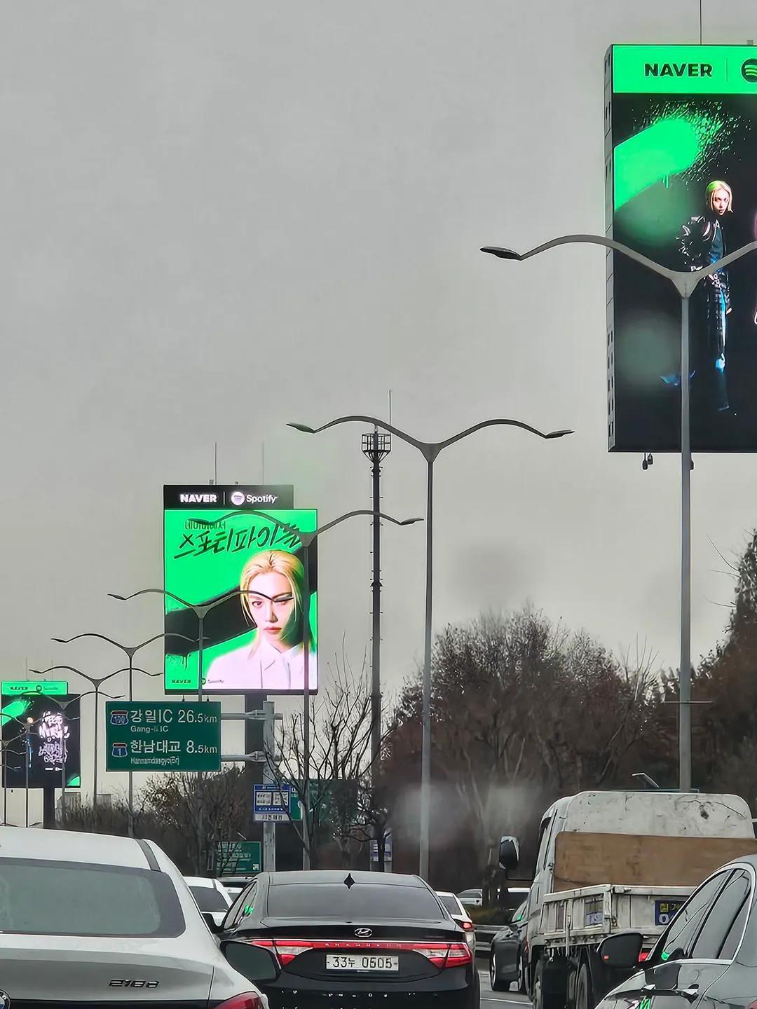 โฆษณาแคมเปญ “Spotify on Naver” ถูกพบเห็นตามทางด่วนโอลิมปิก-แดโร ซึ่งเป็นหนึ่งในทางด่วนสายหลักของกรุงโซล
