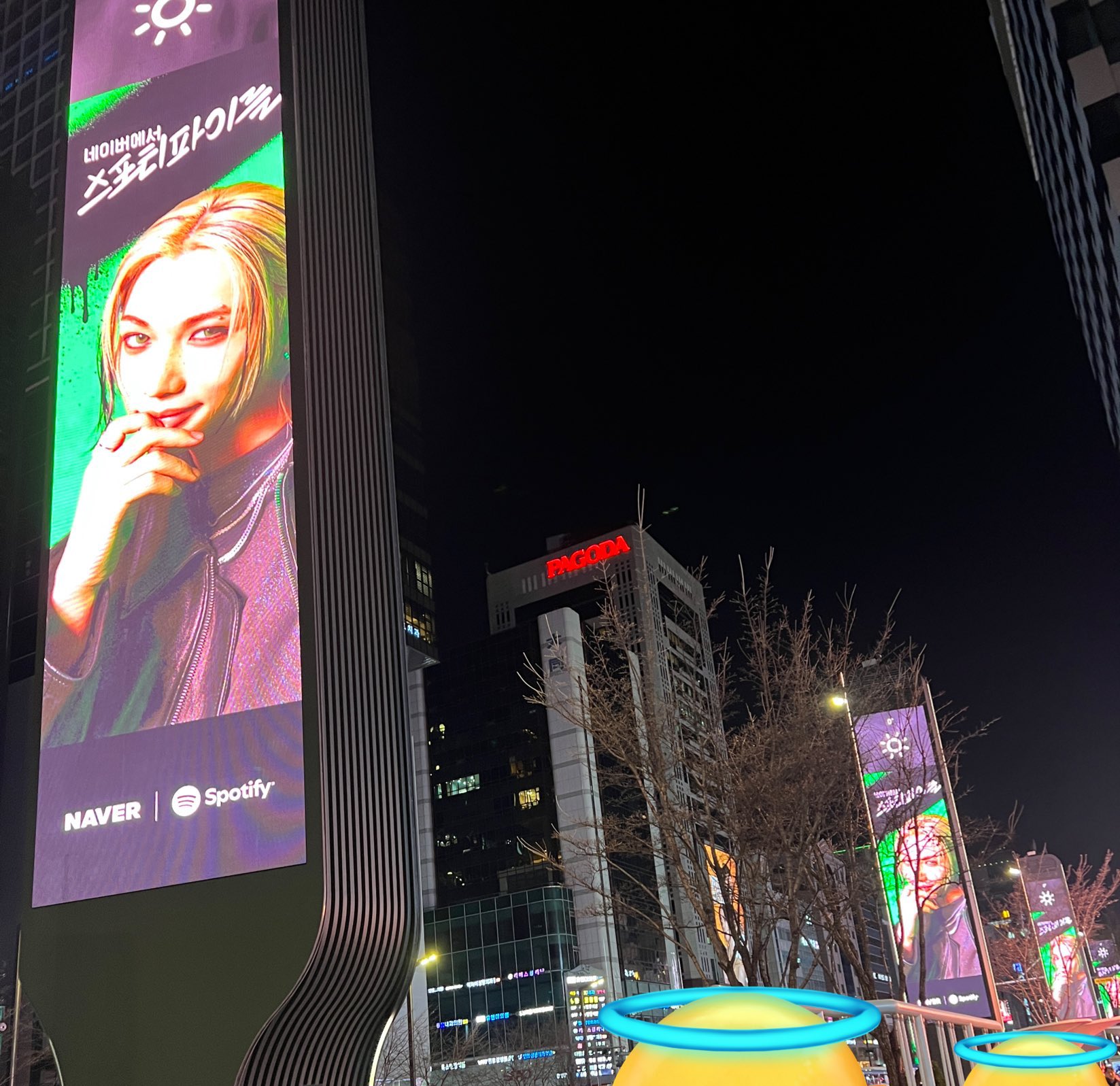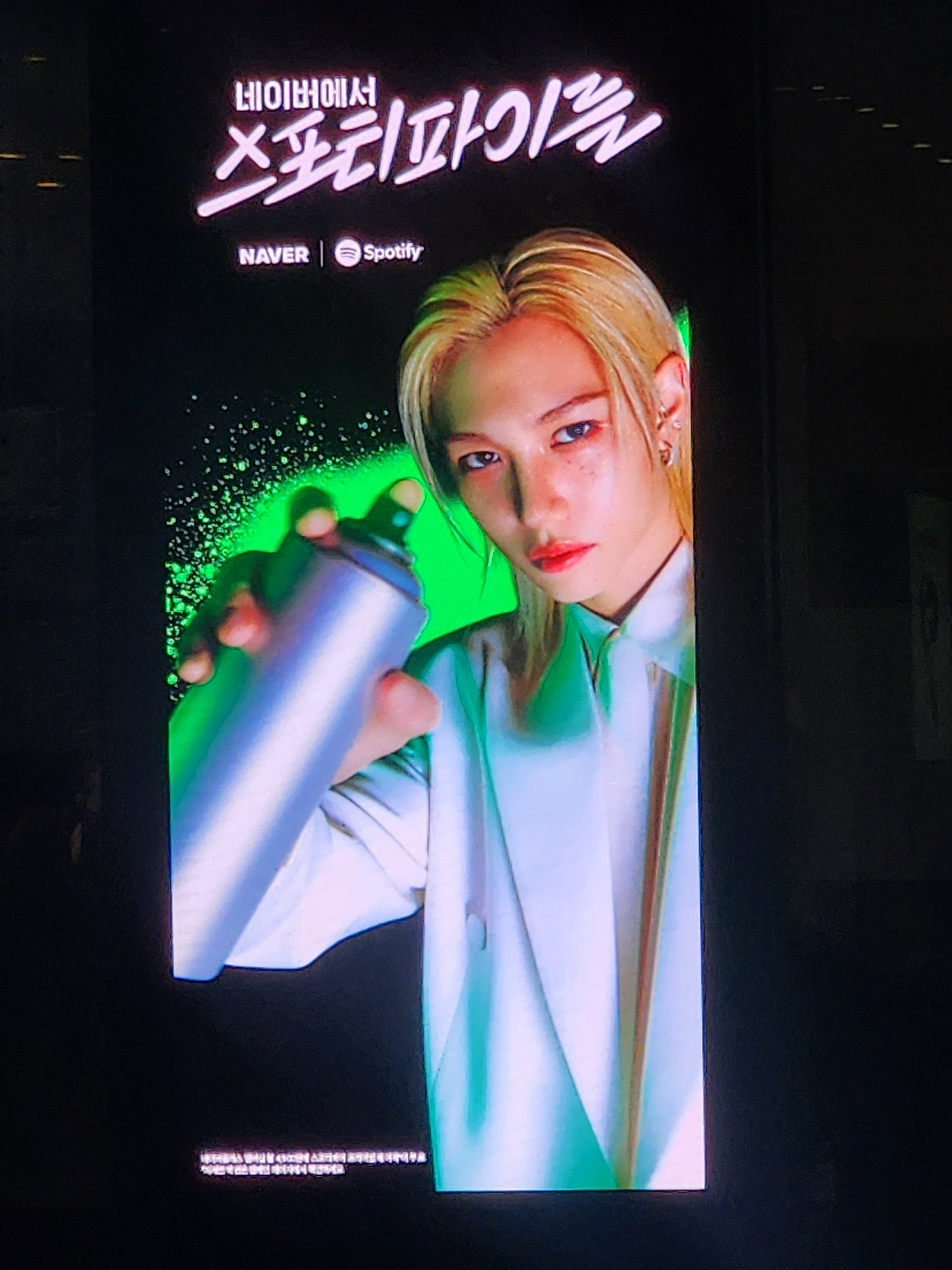 แคมเปญ “Spotify on Naver” ถูกพบเห็นบนป้ายโฆษณาหลายแห่งที่ทางออก 11 สถานีกังนัม