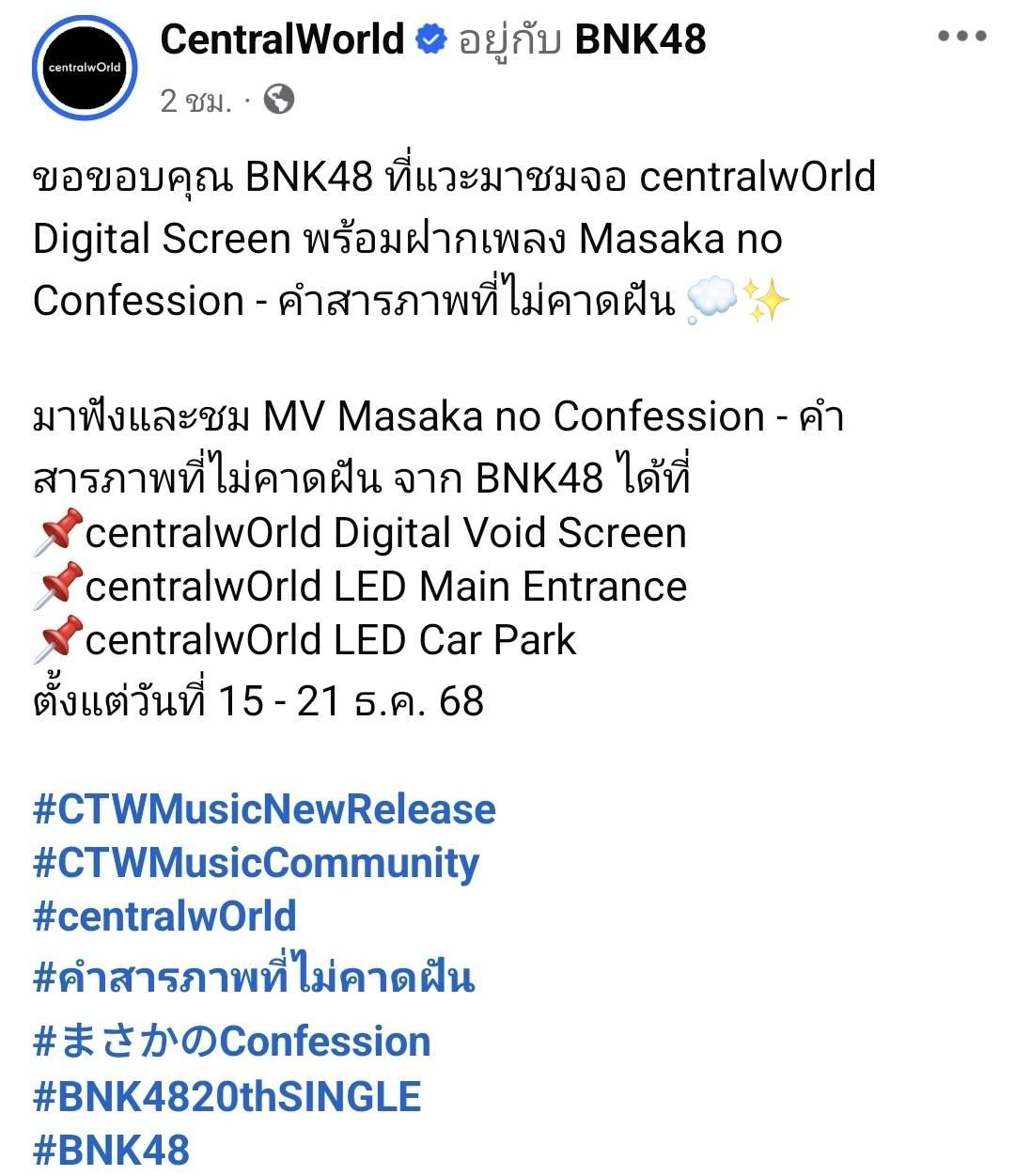 สัปดาห์นี้ เซ็นทรัลเวิลด์ฉายจอโปรโมตเพลงซิงเกิลล่าสุดของวง BNK48 "Masaka no Confession - คำสารภาพที่ไม่คาดฝัน" ซึ่งวันนี้ตัวแทนสมาชิกของวง BNK48 ก็แวะมาชมจอโปรโมตเพลงตัวเองด้วยเหมือนกัน แฟนคลับสามารถรับชมจอโปรโมตได้ตั้งแต่วันนี้ถึงวันที่ 21 ธันวาคม