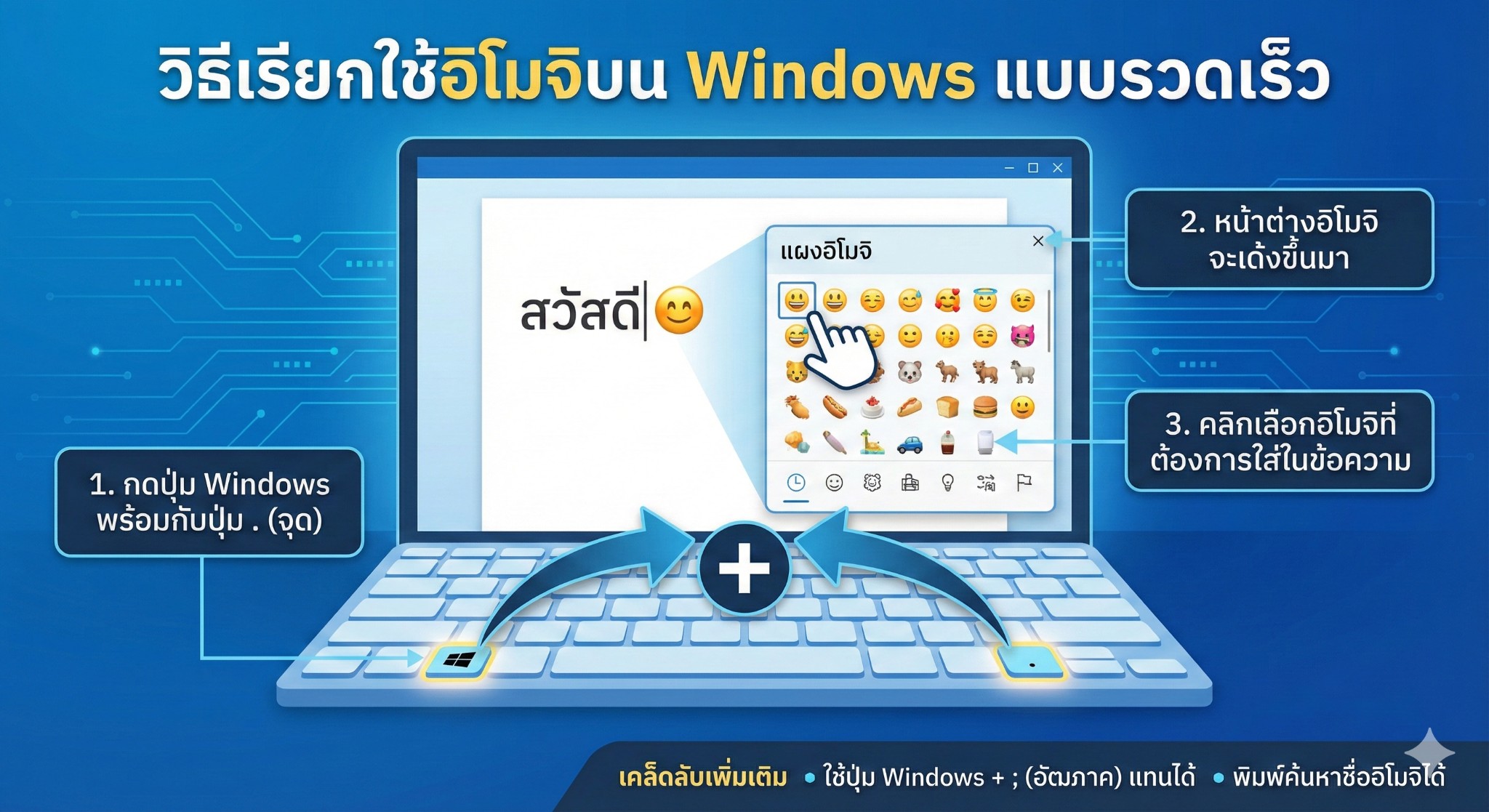 ระบบปฏิบัติการ Windows เปิดใช้งาน Emoji Kaomoji และ Symbol โดยกดคีย์บอร์ด ปุ่ม Windows+; (semicolon) หรือ กดคีย์บอร์ด ปุ่ม Windows