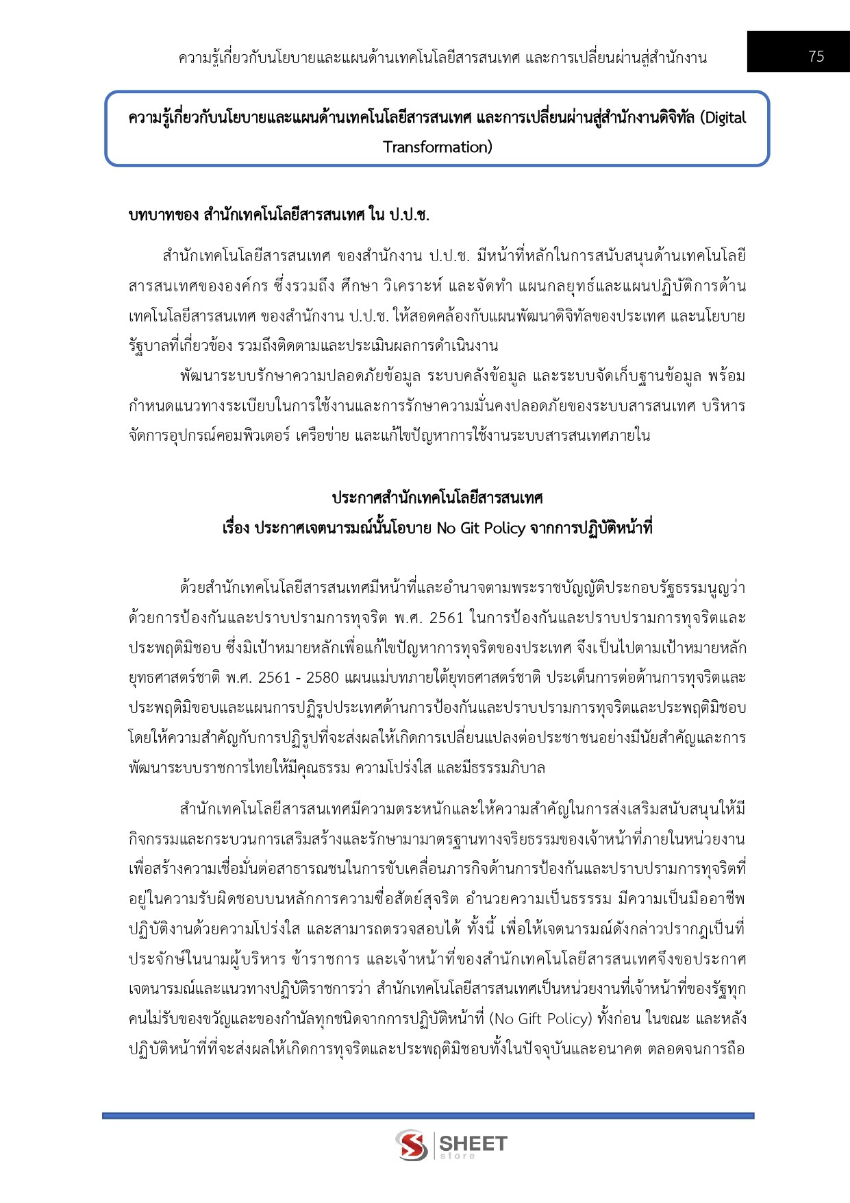 - ความรู้เกี่ยวกับนโยบายและแผนด้านเทคโนโลยีสารสนเทศ และการเปลี่ยนผ่านสู่สำนักงานดิจิทัล (Digital Transformation)
