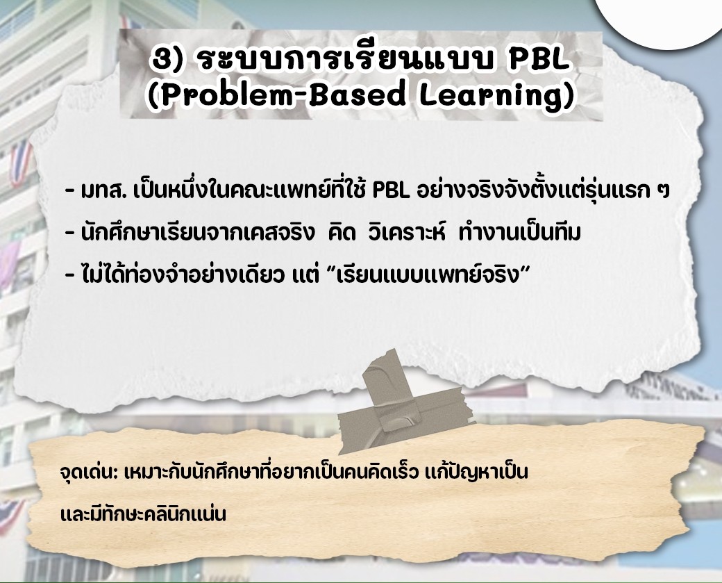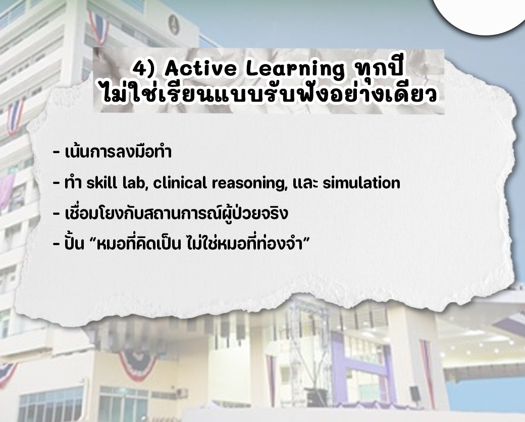 มีการใช้ระบบ Problem-Based Learning (PBL) ควบคู่กับ Active Learning อย่างต่อเนื่อง เน้นการคิดวิเคราะห์ การให้เหตุผลทางคลินิก การเรียนจากสถานการณ์จำลอง และการลงมือปฏิบัติจริง มากกว่าการท่องจำเนื้อหาเพียงอย่างเดียว