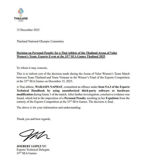 ล่าสุด สมาคมกีฬาอีสปอร์ตแห่งประเทศไทย (TESF) ได้ออกแถลงการณ์ชัดเจนว่า