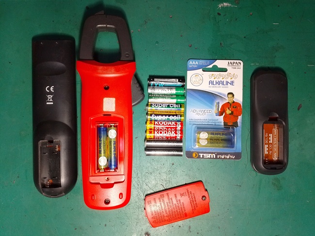 ถ่านอัลคาไลน์ TSM ราชาช้าง มีพี่ท๊อปหรือพี่ไทค์(ไม่แน่ใจ) เป็นพรีเซ้นเตอร์ ตอนนี้อยู่ในช่วงโฆษณาทำตลาดจึงขายถูกเป็นพิเศษ ขนาด AAA ราคา 10 บาทถูกพอๆ กับถ่านจีนโนเนม ผมจึงซื้อมาใส่แคล้มป์มิเตอร์และรีโมทแทนถ่านเก่าซึ่งยังมีไฟอยู่แต่ผมไม่ไว้ใจเพราะบางก้อนเริ่มมีรอบปูดขึ้นมาแล้วก็เลยเปลี่ยนถ่านใหม่ ยกเว้น 2 ก้อนสีดำด้านล่างเป็นถ่านชาร์จ Eneloop แท้เอาออกมาชาร์จไฟใหม่ไม่ได้ทิ้ง สรุปถ่านไฟฉายยี่ห้อนี้ใช้ได้วัสดุดีไว้ใจได้มากกว่าของโนเนมครับ